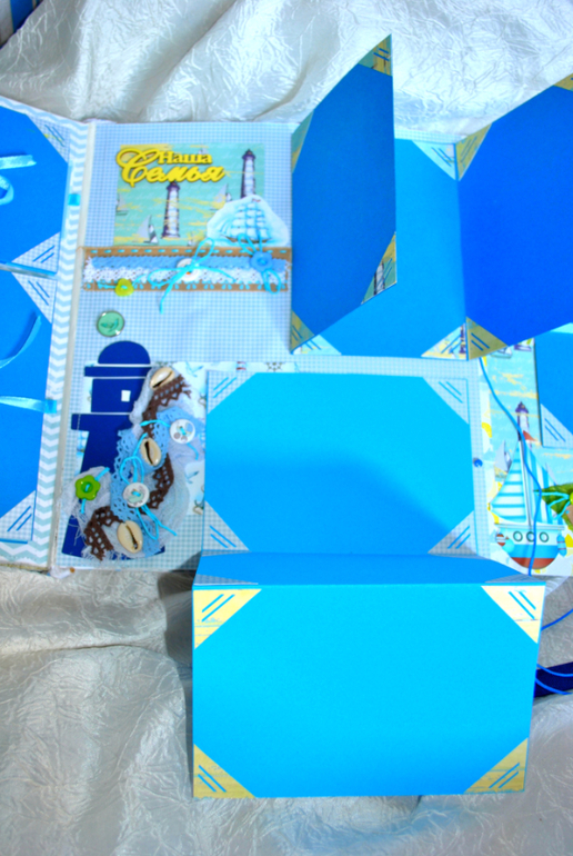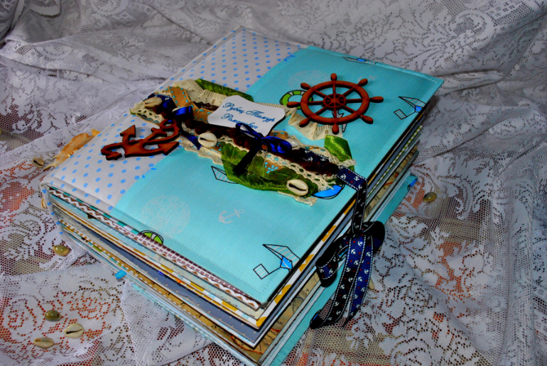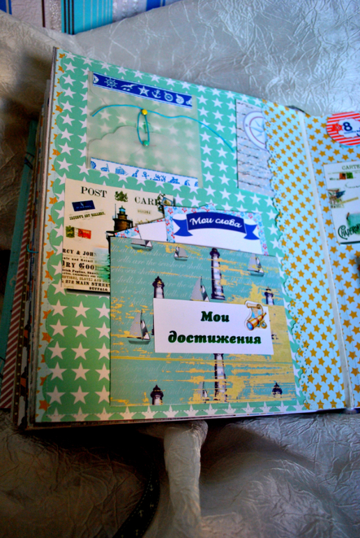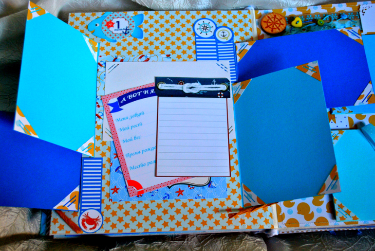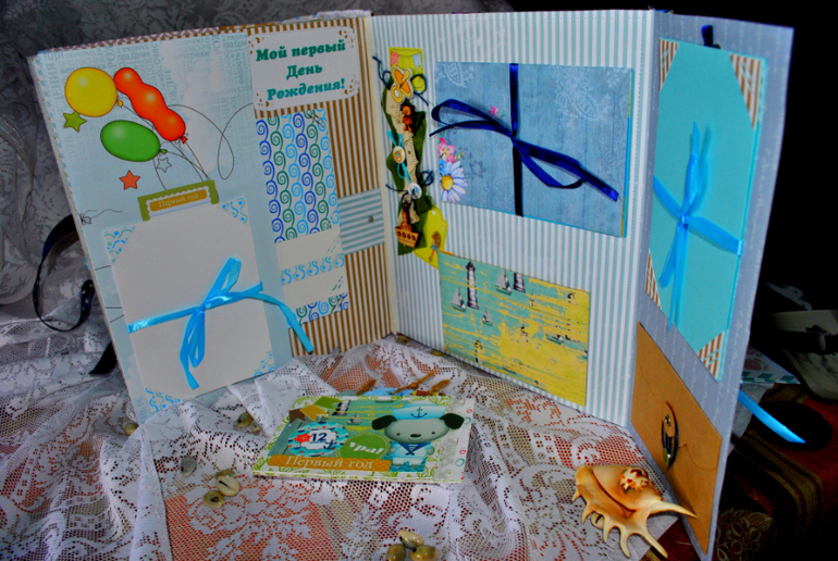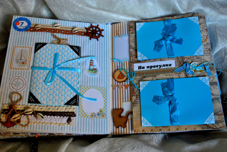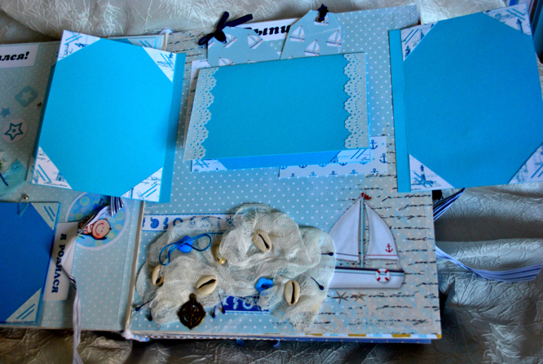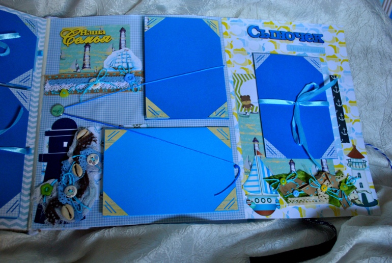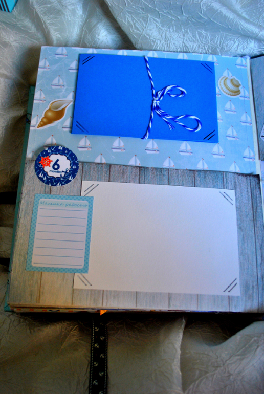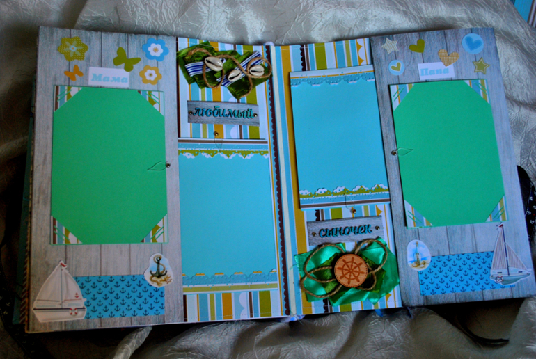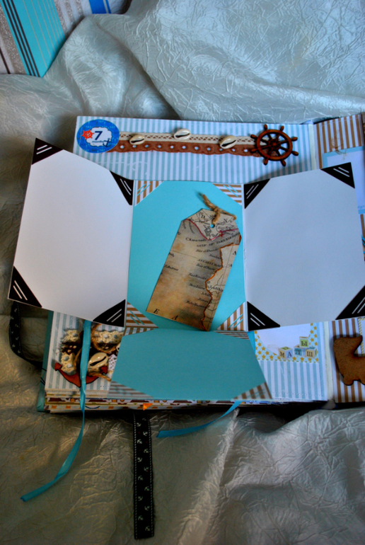 Огромный труд для первого раза! Вы - умничка! У меня только одно замечание - намешаны коллекции бумаги и стили) Если вы выбираете морскую тематику, надо выбрать основные цвета - белый, синий, красный и можно кое-где их разбавить коричневым и песочно-желтым. Или это яркий альбом в американском стиле, но без намеков на море и ракушки) Но в целом - отлично!!!