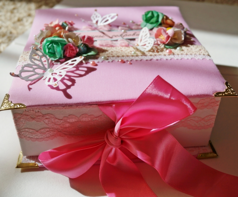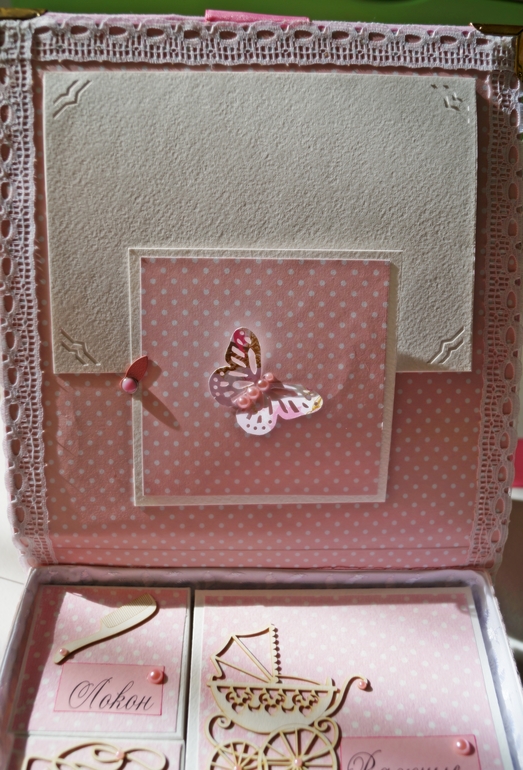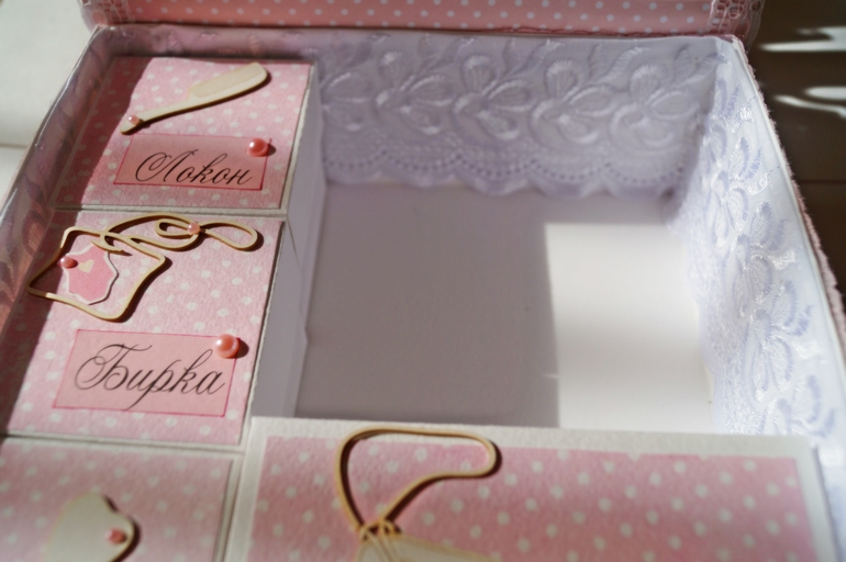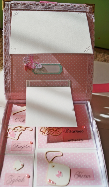 Вмещает в себя 5 коробочек. Размер основной коробки 20*20. Шкатулочка у своей маленькой хозяйки)