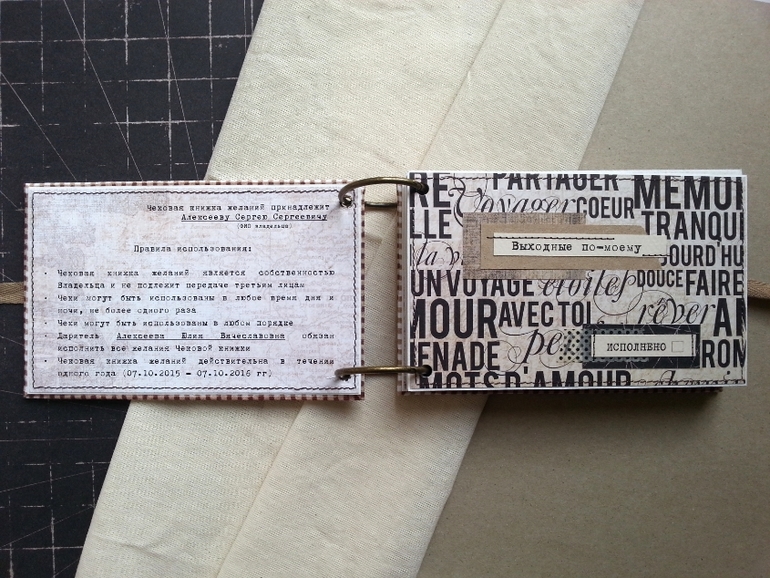 Книги пожеланий, чековые книжки, книжки желаний, кулинарные книгиПокажу еще чековую книжку, сделанную на этой неделе) Это будет подарок мужу на годовщину отношений. Заказала мне ее подруга) Хочу отметить, что в прошлом году на первую их годовщину я делала для нее свой самый первый в жизни альбом!!! А через пол года она заказала мне альбом об их свадебной путешествии)) Понятно, что с чековой книжкой она доверилась мне полностью (впрочем, как и в первых двух случаях))). И это опять таки моя первая чековая книжка и первая работа в мужском стиле))