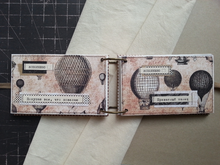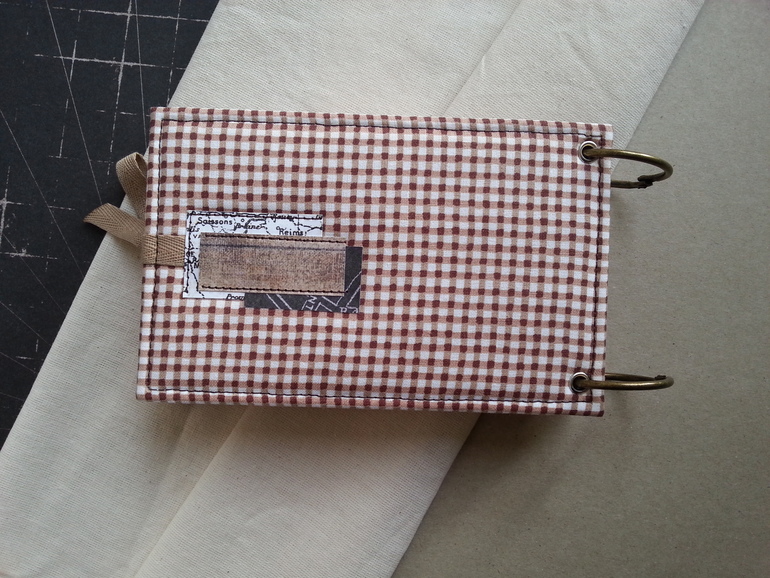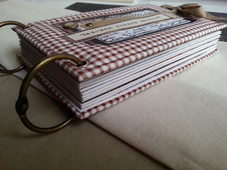 Размер книжки 10*15 см, переплет на кольцах, обтянута хлопком с завязками из киперной ленты. В декоре только скрапбумага, крафт, бумажный скотч, да пара брадс)) Ну и машинная строчка)) В работе использовала бумагу Prima коллекция "Cartographer".