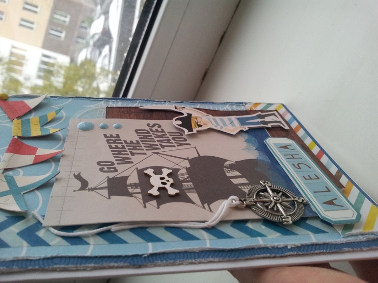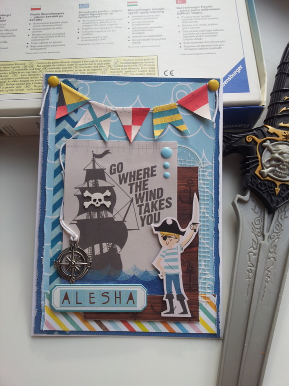 Открытки, приглашения, визиткиДобрый день, а мы вчера праздновали ДР одногруппника из детсада и был аниматор-пиратка, все в полосатых нарядах и прочие тематические радости. Подарок наш был довольно скромным- небольшая коробочка Лего Сити, а хотелось произвести впечатление и сотворилась открытка, благо именно такая классная пиратская бумага была под рукой! Вот и она, упакована была в конверт для сохранности.