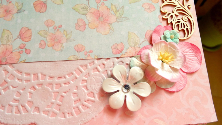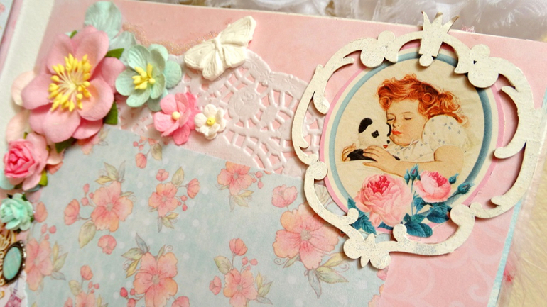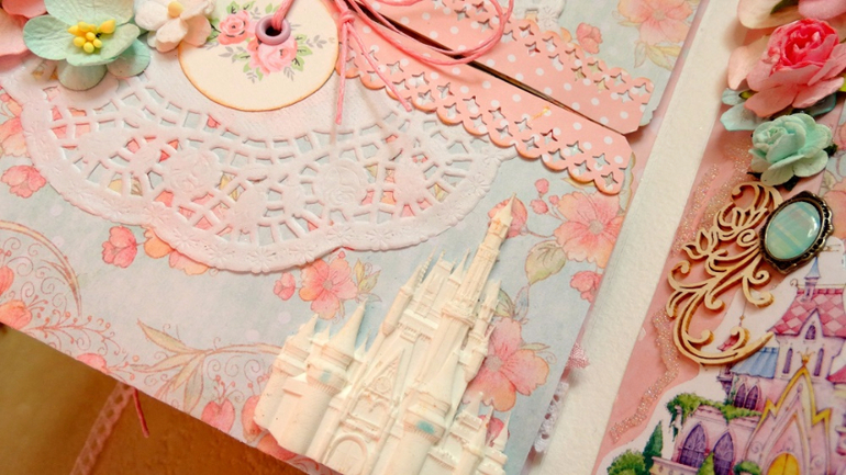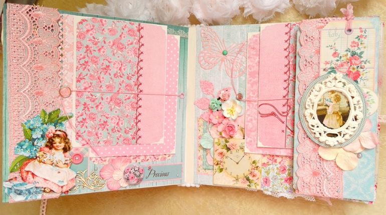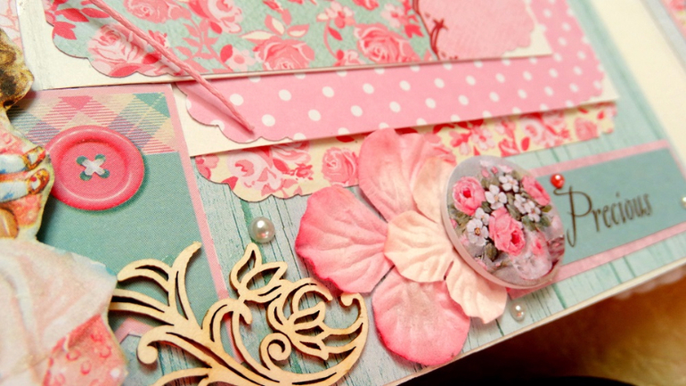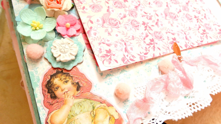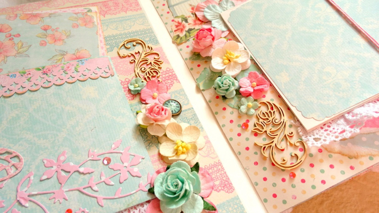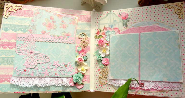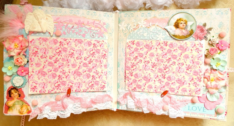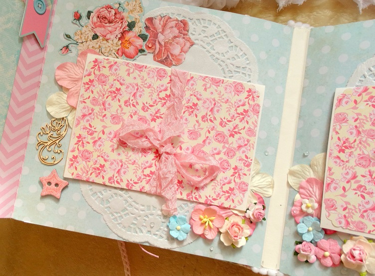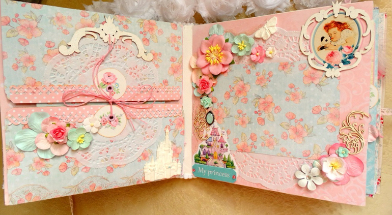 Альбомы ДетскиеДевочки, я к вам с новым альбомом, который был создан за 1 день! (счастливое стечение обстоятельств, когда детей забрали, а муж уехал:) Альбом на пять разворотов, на 45 фото 9х13 (кстати, мой любимый формат фотографий, смотрятся намного лучше, чем большие). Пожелание заказчицы было оформление альбома в мятно-розовом (ну а каком же еще!) цвете, что и было сделано. Основная бумага - коллекция Scrapberry's "Мамины сокровища". Посмотрим?