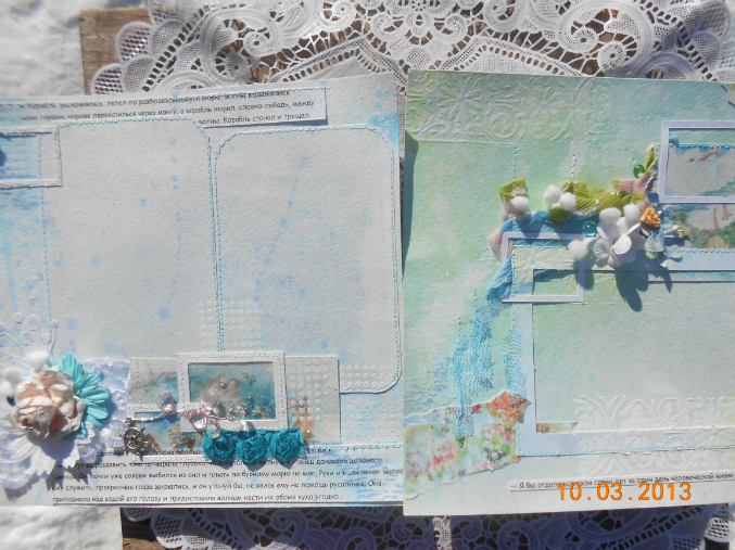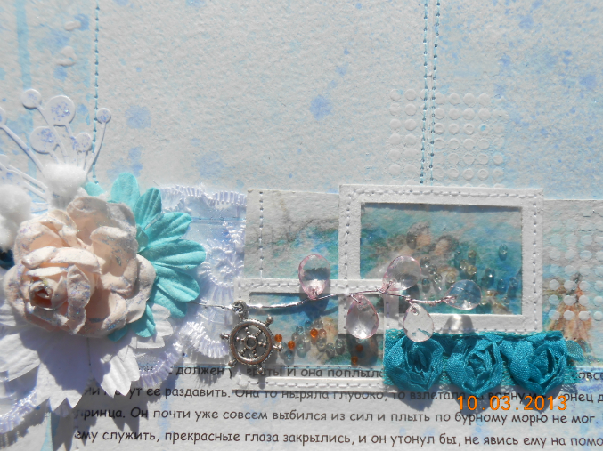 Страничка про то как Русалочка спасла принца во время шторма, поэтому тут и цвета морские и брызки от краски. Штурвал, как деталь от затонувшего корабля.
