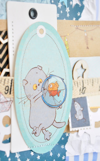 Левая страница - попытка уворовать рыбку с веревки))) Судя по надписи, Пырке это удастся)) Котика я нарядила в бумажную пилотку) шнур из твайна повторяет рыбкину веревочку.