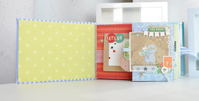 Первый разворот. В качестве фоновой бумаги я выбрала давным-давно лежавшую у меня коллекцию от K&Company, которая была куплена в первом приступе скрап-хомячества для самого первого альбома моего малыша. Прошло всего-ничего 4 года, и она пошла в дело, обожаю эти теплые, но задорные оттенки) Еще она двусторонняя и достаточно плотная, так что проблем с этим отгибающимся секретиком у меня не было)) Тематика первой страницы - Выступление рок-звезды)))))))