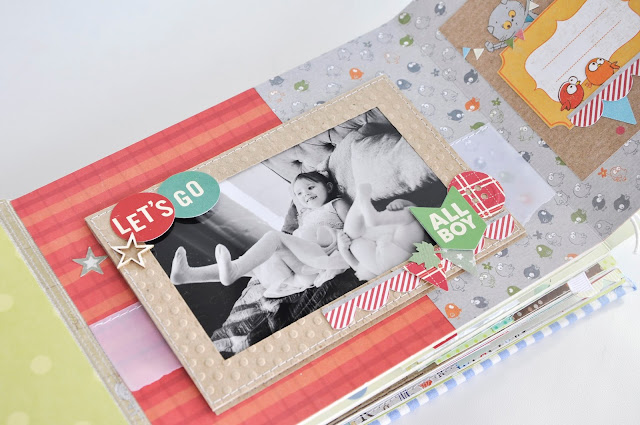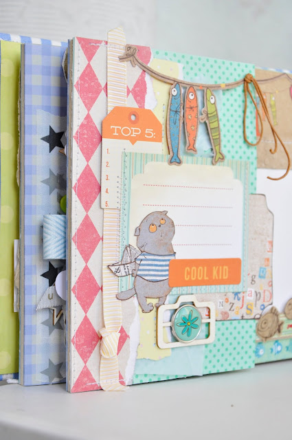 Обложка обтянута полосатым хлопком, с магнитной кнопкой-застежкой - на ней кусок бумаги из другой коллекции Scrapberrys - Старый Цирк. Для альбома я старалась подбирать бумаги ярких цветов, но спокойных, не кислотных, даже немного ретро-оттенков. Ретро-эстетика в последнее время очень мне близка) Кроме вырубки, вырезалочек и чипборда я задействовала тесьму, кусочек оверлея и бумажку-тишью. На фоновой бумаге есть отверстия в виде звездочек - это я вырубала с краешку, а потом решила не обрывать этот кусок, а оставить в качестве дополнительного декора)
