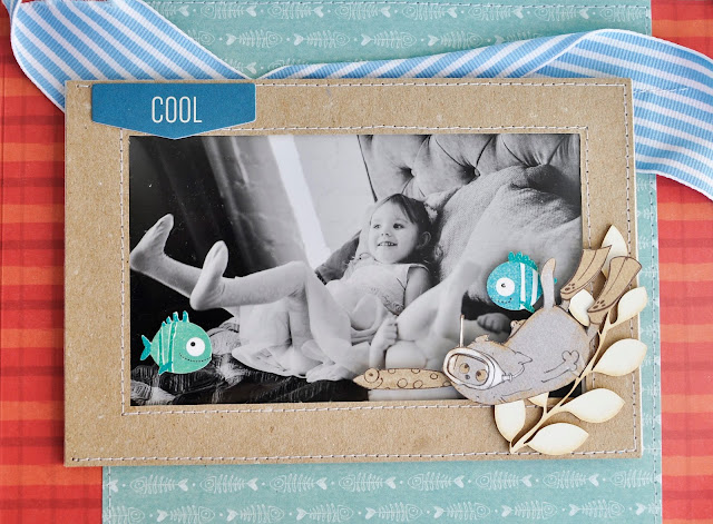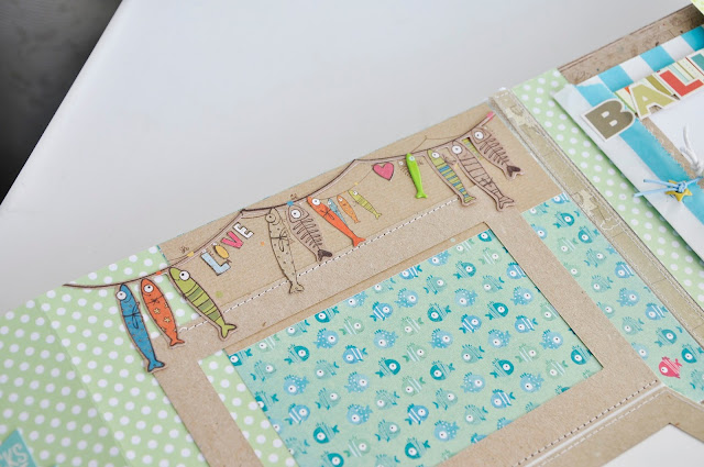 Это место для фото под пленкой, на пленке я расположила пару рыбок и ныряющего Пырку) Чипборд от Prodelkino имитирует водоросли), а лента сверху - поверхность воды