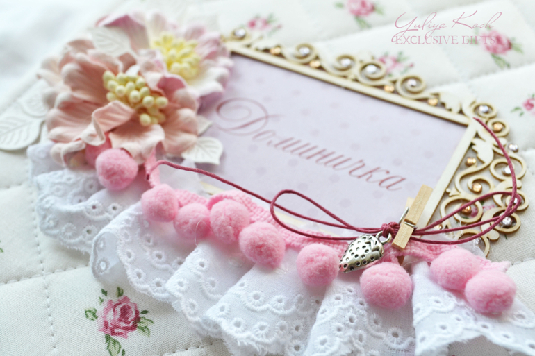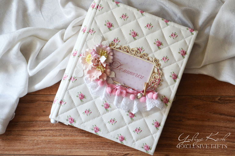 Обложка простегана, украшена чипбордом, помпончиками)) цветочками, кружевом и прищепкой, которая держит клубничку)) Фото очень много))