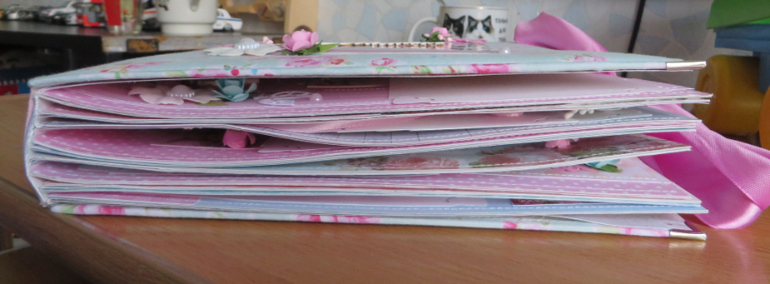 Согласна со всеми, очень тонкая основа у вас и очень маленькое расстояние между страницами, 0,5 см я делаю только если вообще никакого декора нет кроме бумажного. Даже на фото видно - где розочки, там и перекос сразу, они вообще декор неудобный, хотя и очень красивый, как минимум сантиметр надо делать. А вообще, если есть сомнения с расстоянием, я обычно сначала все страницы декорирую, потом складываю стопкой как они в альбоме будут, и меряю расстояние между страницами, так проще определиться. И еще мне кажется корешок немного маловат, на первом фото такое впечатление, что между первой страницей и обложкой совсем нет расстояния.