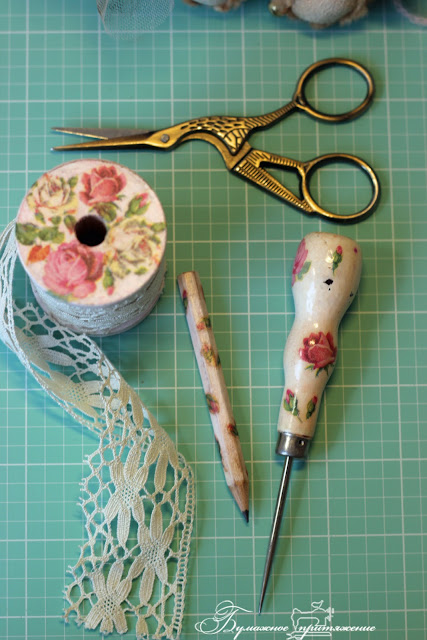 Обложка сложилась очень быстро, как-то сама собой... Карточка со швейной машинкой определила характер блокнота - блокнот рукодельницы, хотя записываю я в него все подряд, и планы на день-месяц-год, и многочисленные идеи новых альбомов (находка для шпиЁна просто)). Всё в "жутких розочках", но, видимо, именно этого мне и не хватает сейчас... В то же время минималистично, плоско и практично - все-таки вещь сугубо утилитарного свойства, часто проживает в сумке и в машине. На обложку пристроила карандашик (хвала Икее)), даже решилась на маленький декупаж: