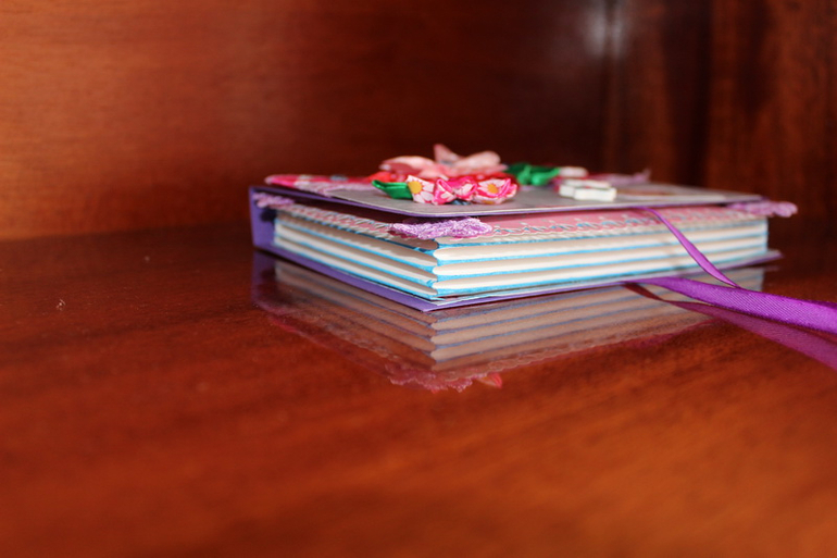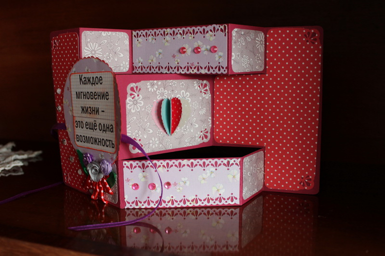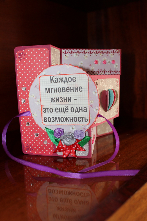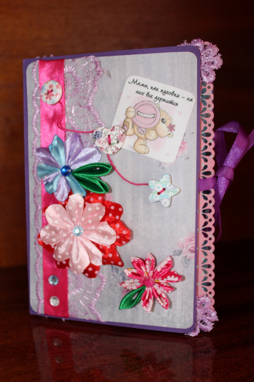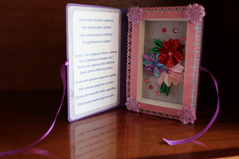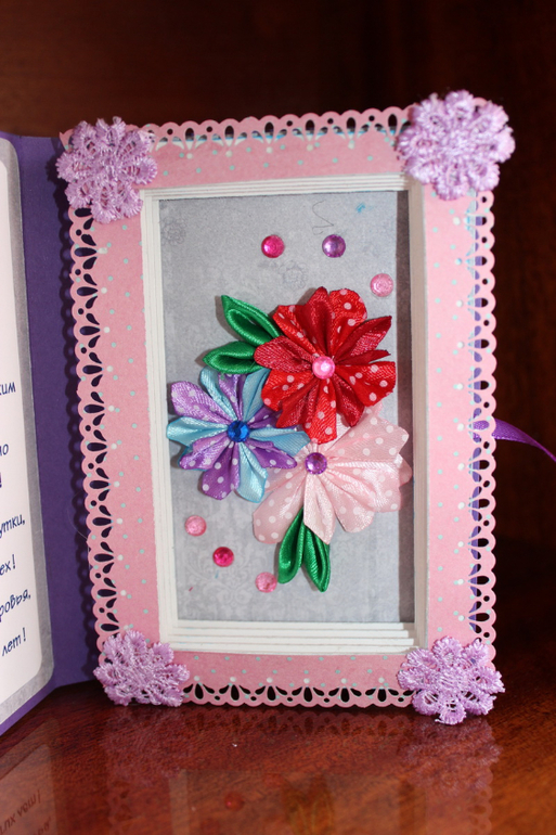 2. Замените атласные ленты и синтетические кружева на лен, хлопок, шебби-ленты. Но если вам нравится делать открытки именно с атласными цветами, то тогда изучите технику канзаши. Добейтесь аккуратных, красивых и интересных цветов. Складывайте из них композиции и пусть эти цветы будут основным и главным декором.