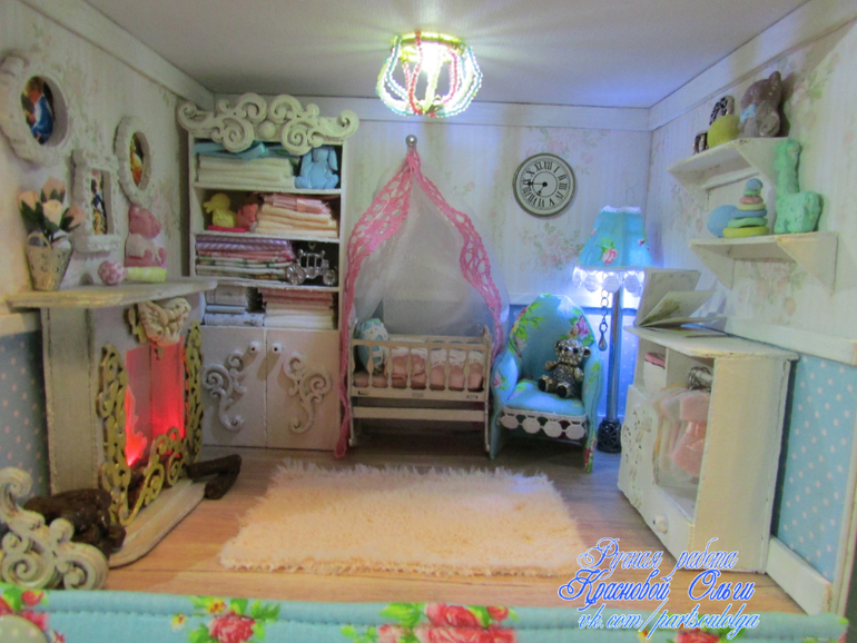 Миниатюра: детская комнатка выполнена с нуля. Есть освещение(торшер,верхний свет и камин). Батарейки сделала к каждому источнику отдельно, они заменяемые("мизинчиковые"). Стоимость может варьировать от используемых материалов. На все вопросы отвечу с удовольствием.