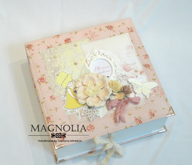 Надпись на обложке защищен пластиком, помещена в пластиковую рамочку. Углы защищены металлическими уголками. Основа коробочки изготовлена из 1мм картона и обтянута белой декор. бумагой с текстурой под лён.