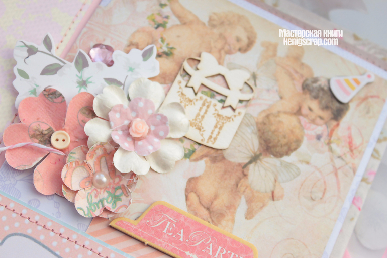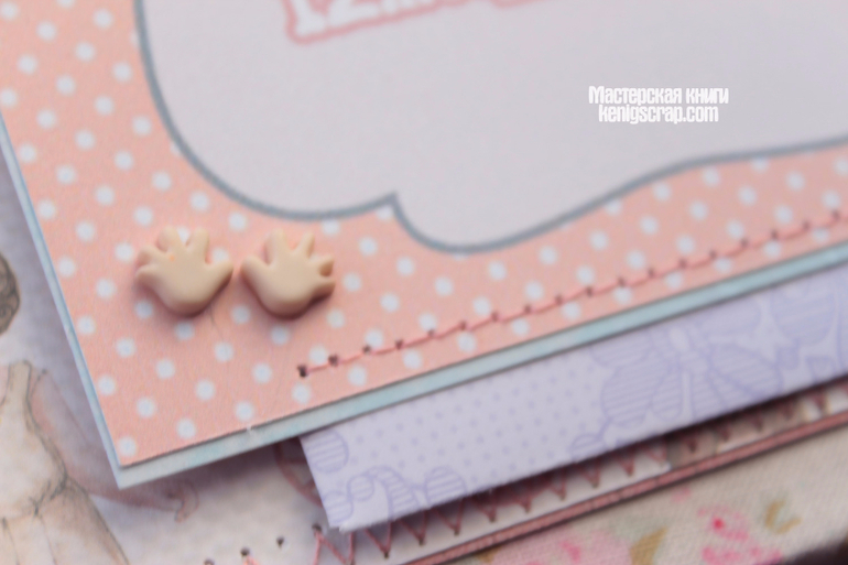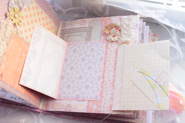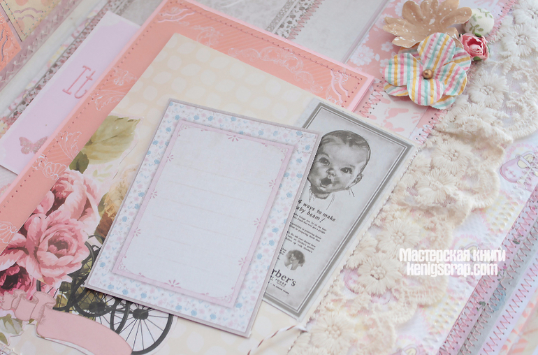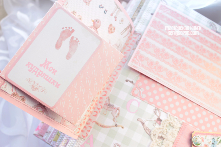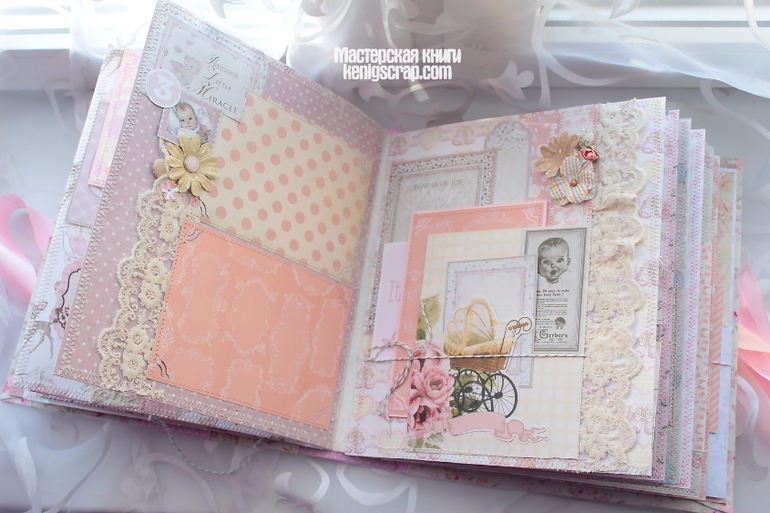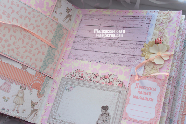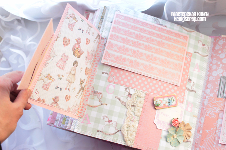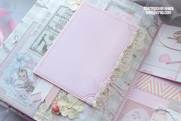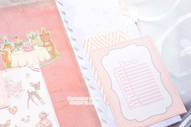 Обложка из хлопка разных видов комбинированная. В альбоме много винтажного кружева. Бумага из детских коллекций Кайзеркрафт и Майя дизайн. С оленятами бумажка от Тримкрафт. Некоторые листочки с глиттером. Кайзеркрафт , кстати, были последние из старой коллекции. Теперь таких и не сыскать наверно.Очень уж они полюбились)