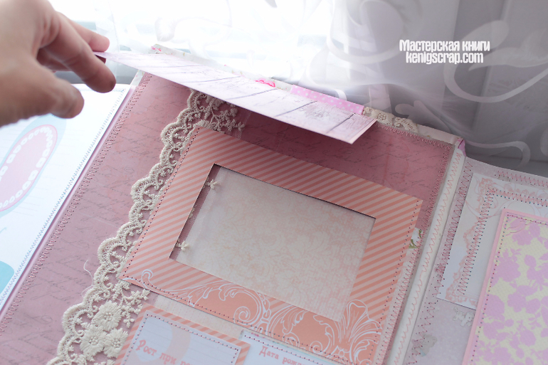 Альбом размером 26*30 см, 10 разворотов.В него помещается 65 фотографий (45 горизонтальных,20 вертикальных), и это только в подложки, а еще много всяких секретных конвертиков и кармашков, в которые можно разместить еще столько же.