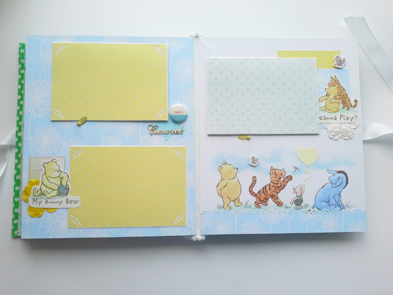 Альбомы ДетскиеАльбом для мальчика Винни Пух. Размер 23х27 см, рассчитан на 48 фото 10х15 и 2 фото 10х10см. 6 разворотов. Использовано много надписей и забавных фишек.