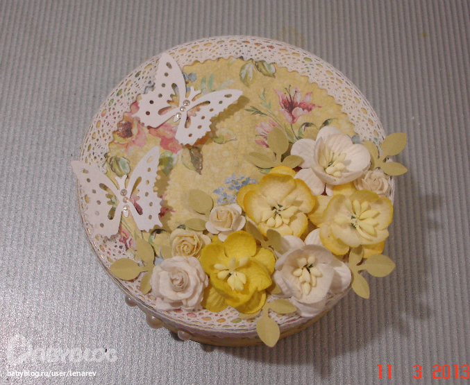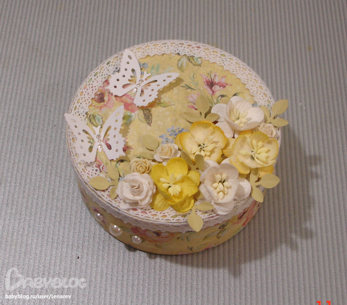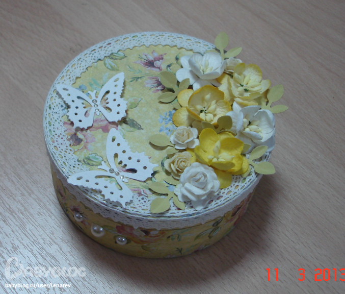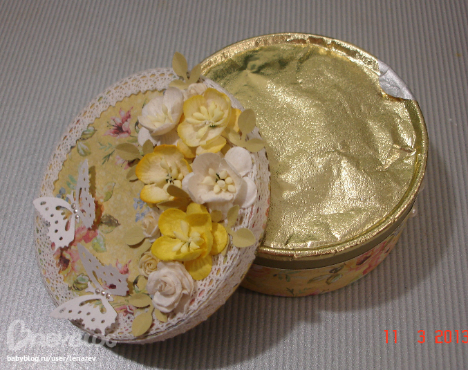 Коробки, шкатулки, комодыНе присутствующей на прошедшем празднике коллеге сделала тоже коробочку, купила готовую банку с монпасье и даже не вскрывая ее обклеела, ничего сверх нового, все как всегда. (фото в 4 часа утра)