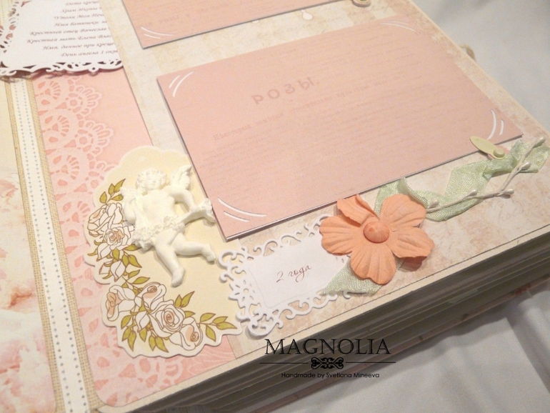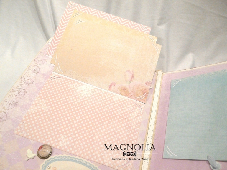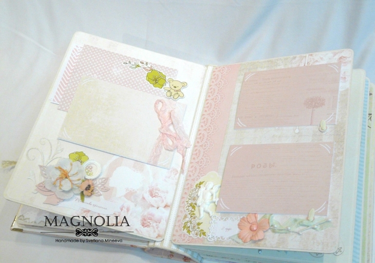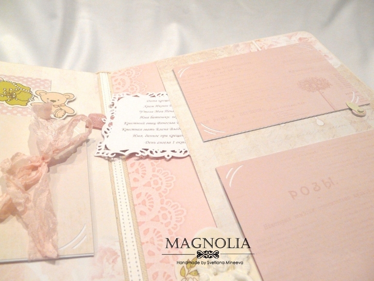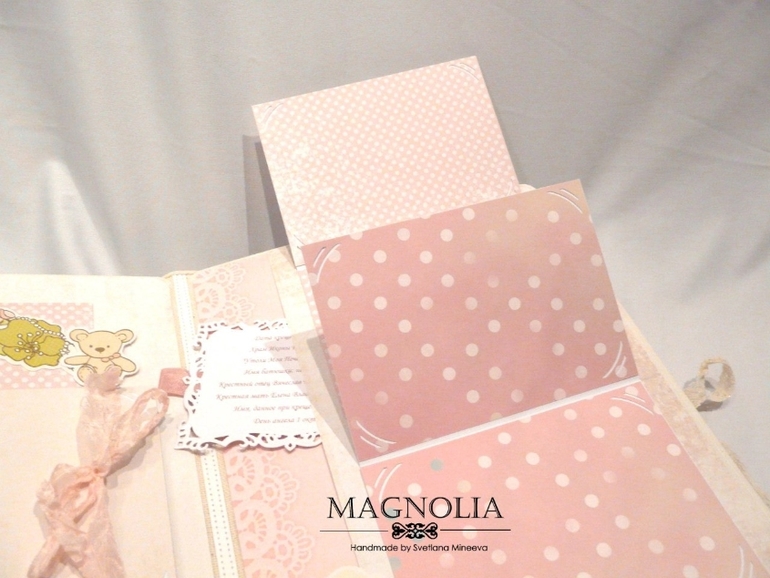 3 разворот для фото 2 года жизни. на первой странице места для фото с крестин, большой карман для маленьких фот. На 2-ой странице большой карман для свидетельства, где так же хранится тег с данными о крещении