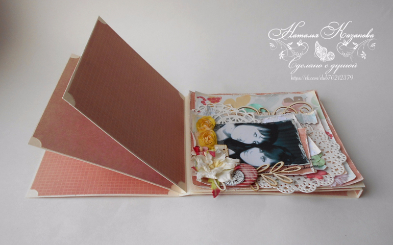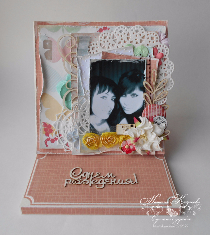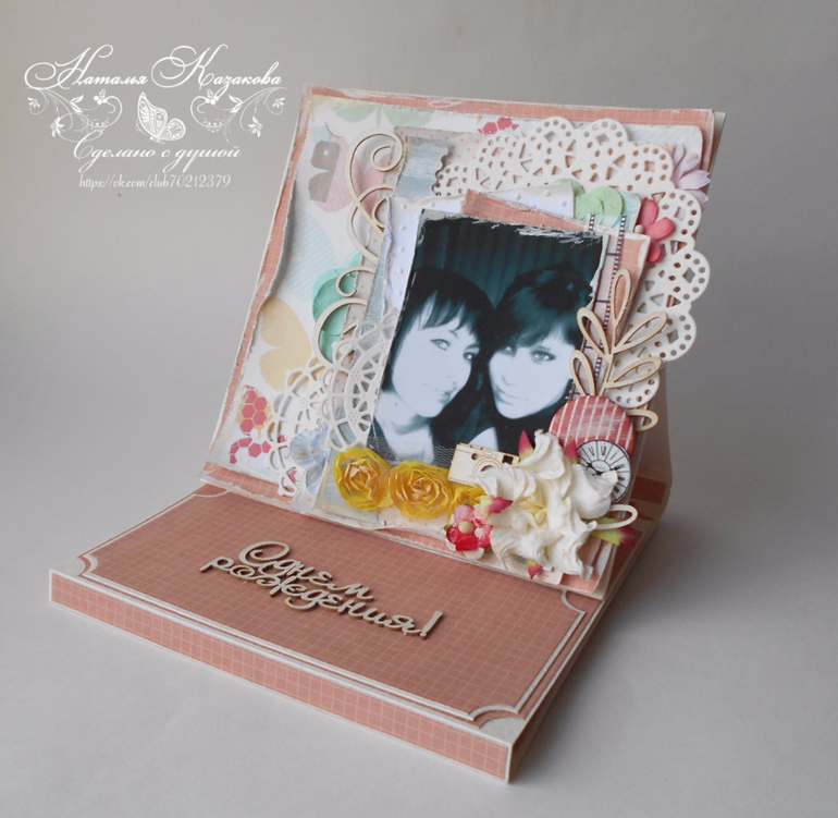 Со второй открыточкой на мой взгляд дела обстоят сложнее. Здесь внутренний голос мне подсказывает, что что-то не доработано. Эта открыточка предназначена подруге заказчицы на День рождения. Девушка выбрала это фото и сказала: "Твори!". У этой открыточки более сложная конструкция. Это открытка-мольберт, известная многим скраперам, но она усложнена еще и тем, что является еще и миником.