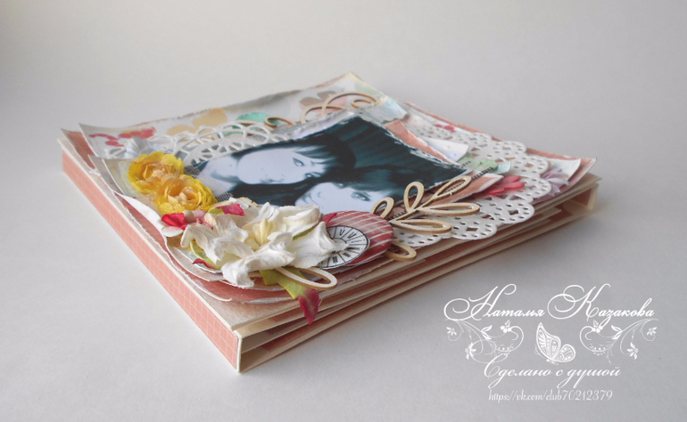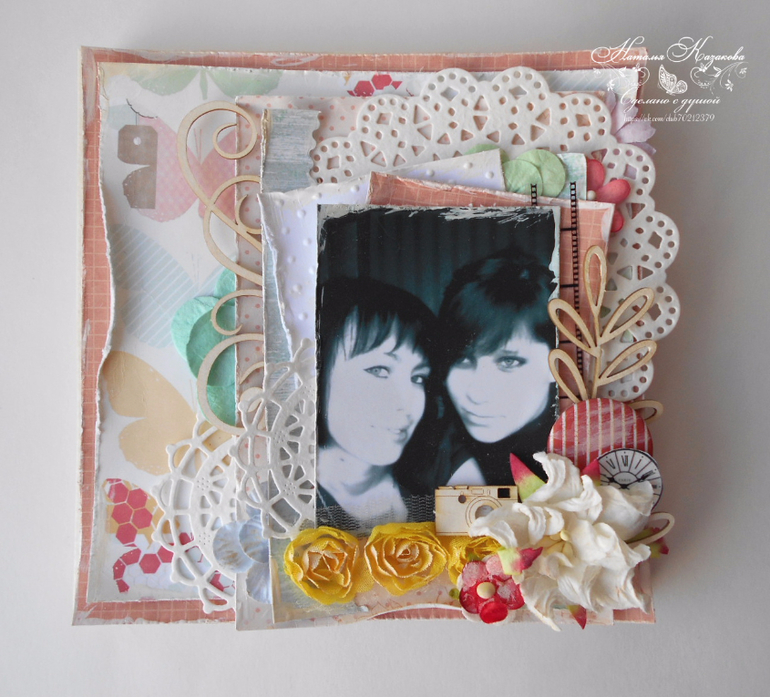Думаю многие смотрели МК Марины Сысковой на тему новогодней многослойной открытки, так вот, просмотр этого вебинара подтолкнул меня к такой композиции. Я даже осмелилась написать Марине сообщение и просила оценить открытку. Она к моей радости ответила, сделала парочку небольших замечаний по композиции, впоследствии я исправила ошибки и открыточка осталась в таком виде, оцененная и похваленная знаменитым мастером.Открыточка для меня была сложна, т. к. я никогда не работала с фото в открытках. Поэтому это мой дебют. Многослойность выбрала не спроста. Очень не люблю, когда открытки с фото похожи на могильные рамки с цветочками, очень старалась избежать этого эффекта. Также многослойность здесь символизирует крепкую женскую дружбу, проверенную годами и различными событиями.