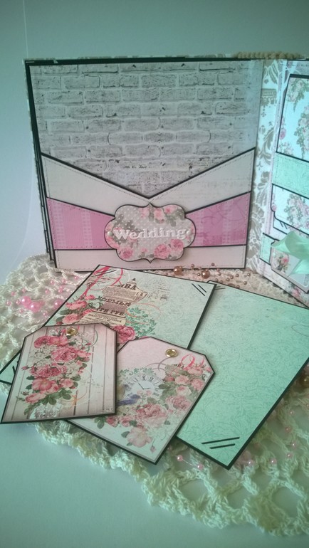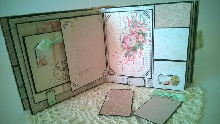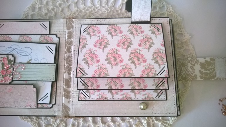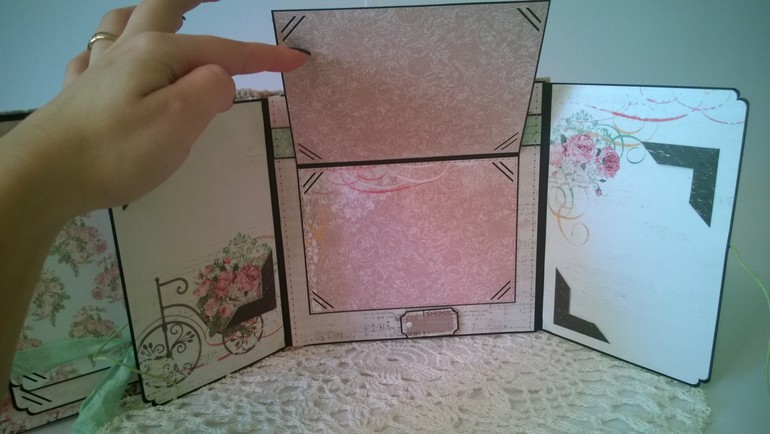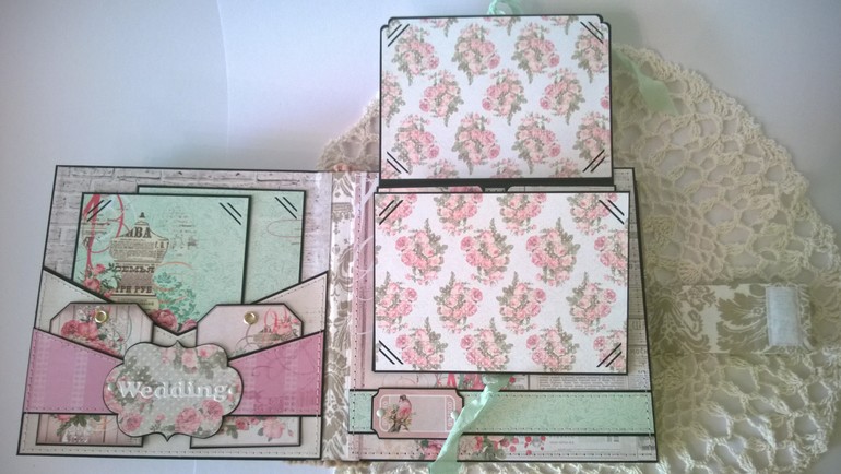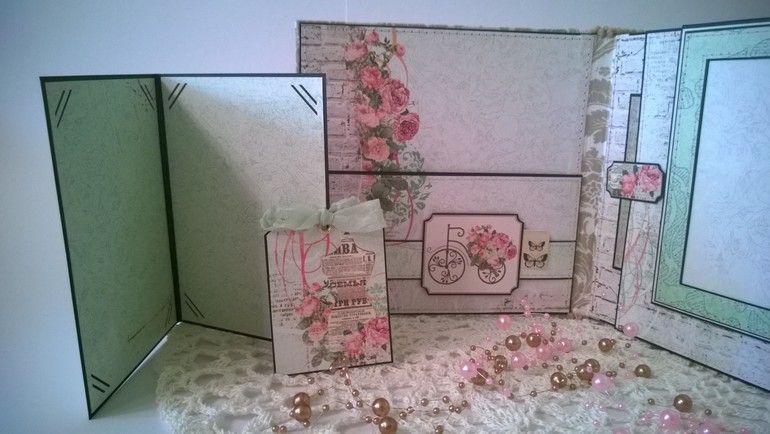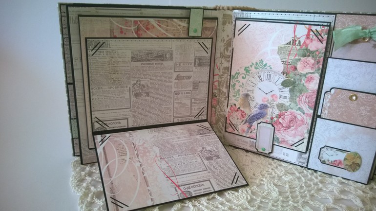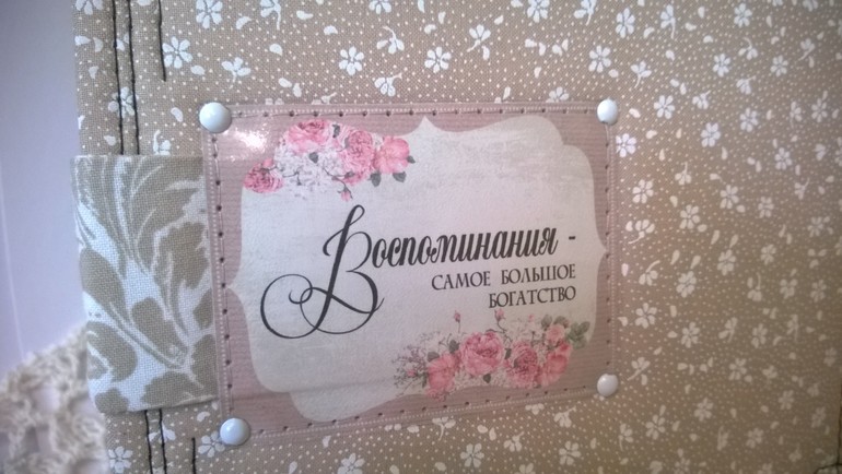 На 1 странице у меня объемный карман, в который вставляется книжечка на 4 фото, под горизонтальной полоской на кармашке спрятан тэг для записей (или просто для красоты)