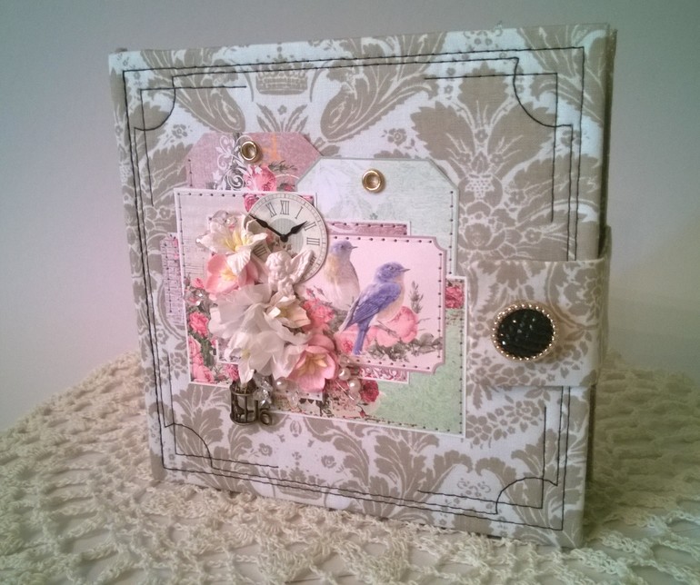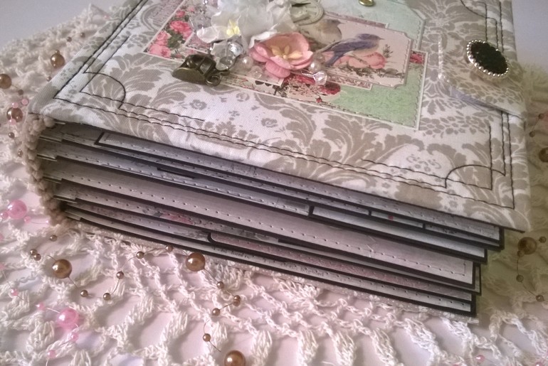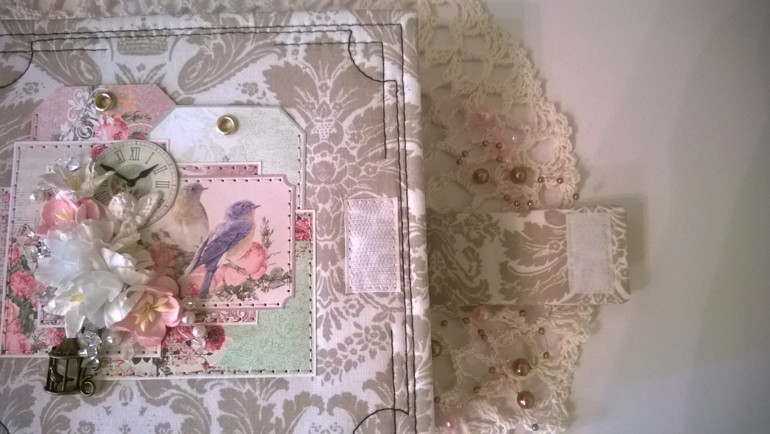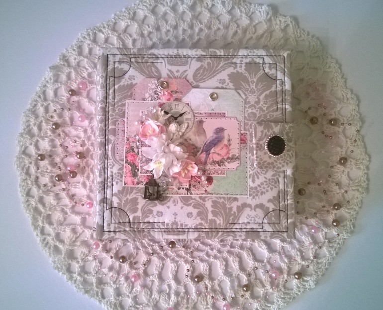 Весь объемный декор у меня только на обложке: здесь и картинка с птичками, ниже и левее клетка для них в виде подвесочки, также цветочки, часики и веточки с прозрачными камушками и молочным жемчугом
