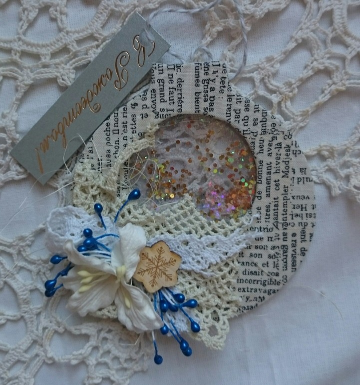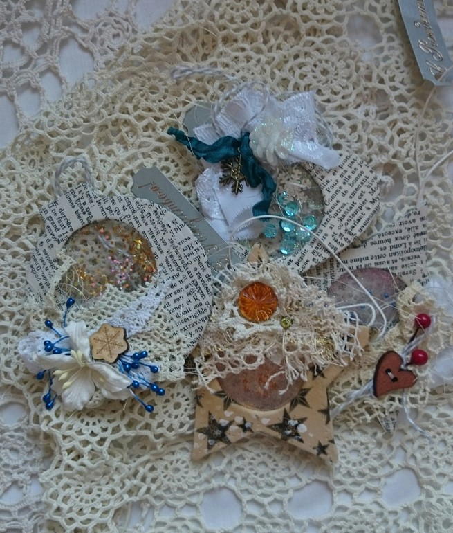 7. При желании пройдемся белым грунтом по нашим игрушкам, украсим их чипбордом, цветочками, снежинками и лентами. У меня получилось вот так.