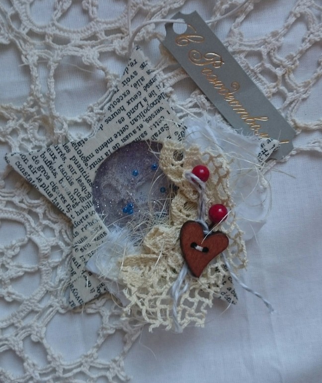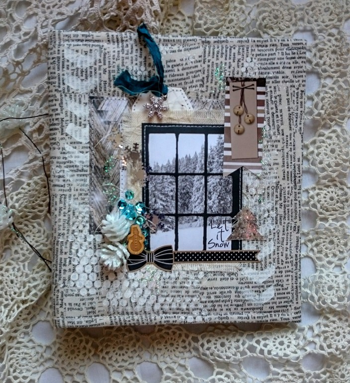 У меня как-то ничего новогоднего нет, кроме бумаги, поэтому сделала из того, что было дома. В верхнем углу красный цветок - это ткань, которую я приклеила на пва на картон и вырезала по контуру. В противоположном углу цветок из бисера, мне его притащила как ненужное сестра из свадебного солона и я его покрыла блестками.