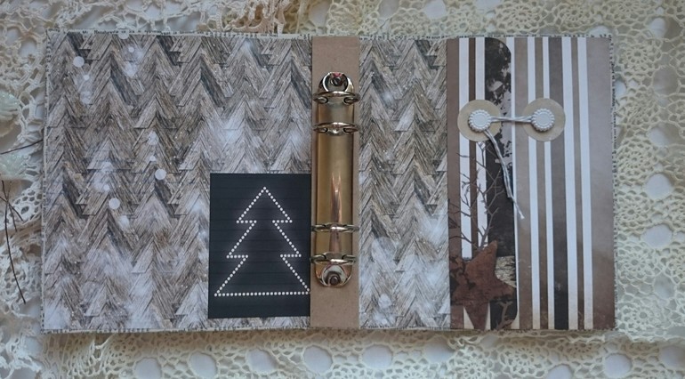 10. Полоску бумаги, оставшуюся от первого форзаца, приклеиваем на второй корешок, отгибаем припуски назад, срезаем уголки и приклеиваем припуски. Теперь нужно измерить расстояние между отверстиями на кольцевом механизме (у меня 11,5см). Размечаем на корешке это расстояние от середины полоски вправо и влево, так же следим, чтобы отверстия расположились на центральной линии (т.е. ширину полосы 3,2см делим пополам, получается 1,6см от края). Делаем шилом отверстия в получившихся двух точках и с помощью 2 брадс закрепляем наш механизм. Далее используем либо момент, либо я клею на горячий пистолет. Получившуюся заготовку с механизмом обильно смазываем клеем и прижимаем к основному корешку внутри обложки. Если у вас не хватает навыка, то лучше клеить на момент, тогда у вас будет время, чтобы окончательно выровнять деталь относительно обложки. Проследите, чтобы деталь приклеилась по центру и не мешала обложке открываться-закрываться. Фиксируем деталь канцелярскими зажимами до полного высыхания.