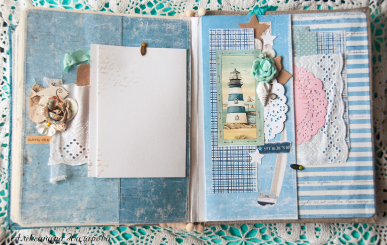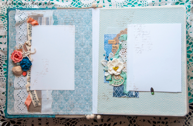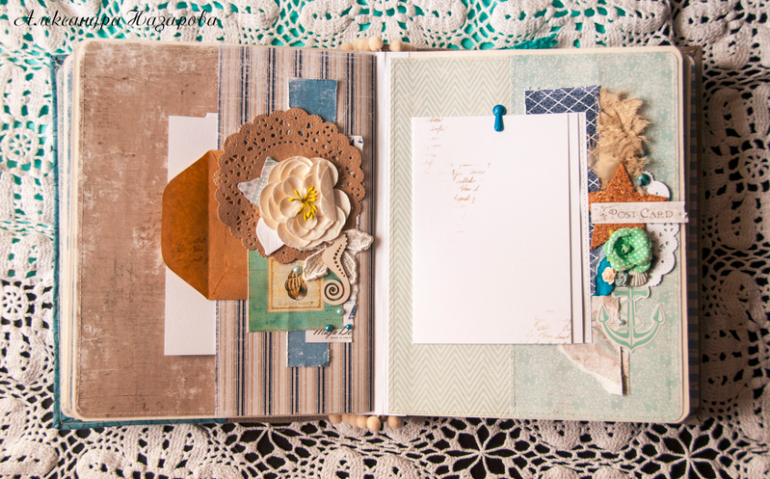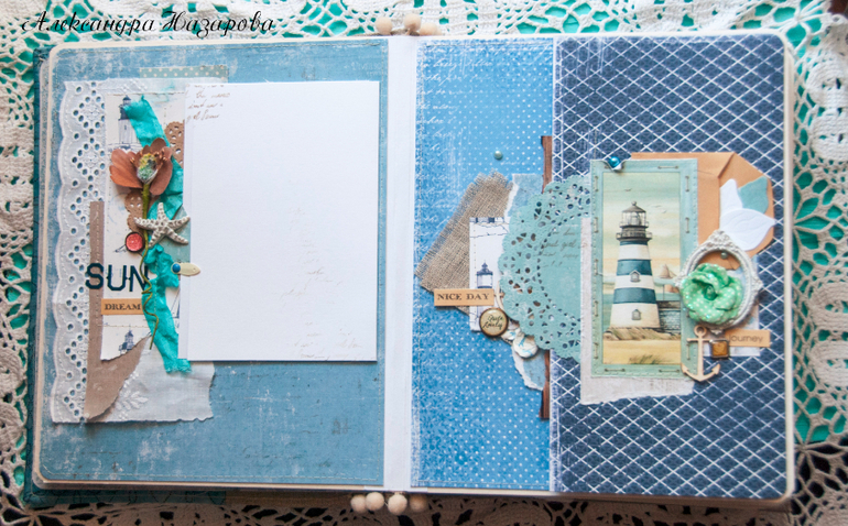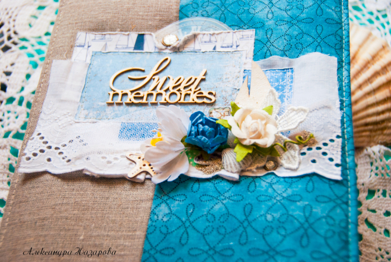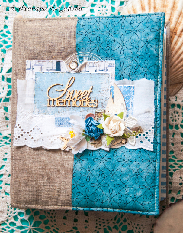 Мягкая текстильная обложка скомбинирована из грубого льна и нежного хлопка, украшена шитьем, цветами и настоящими ракушками!