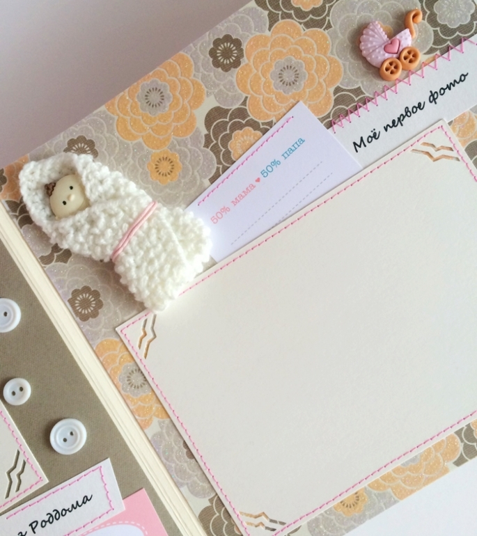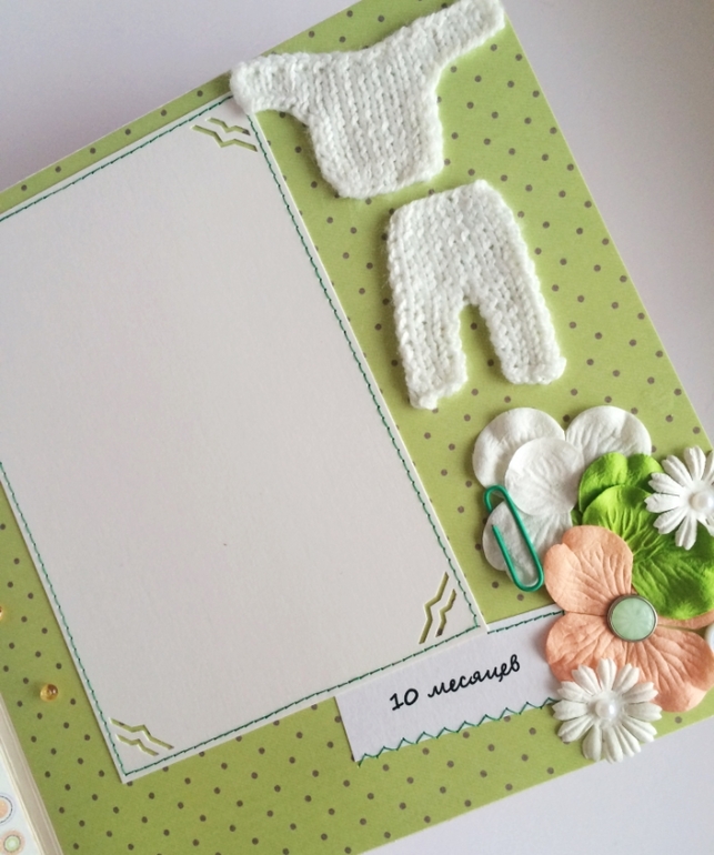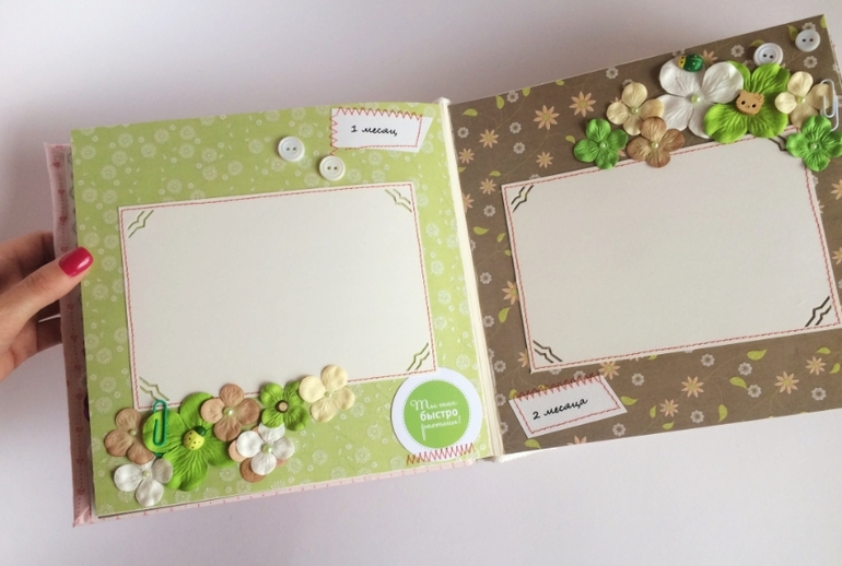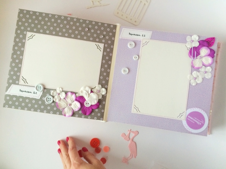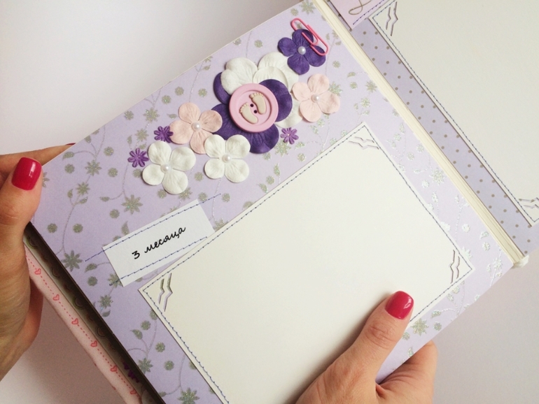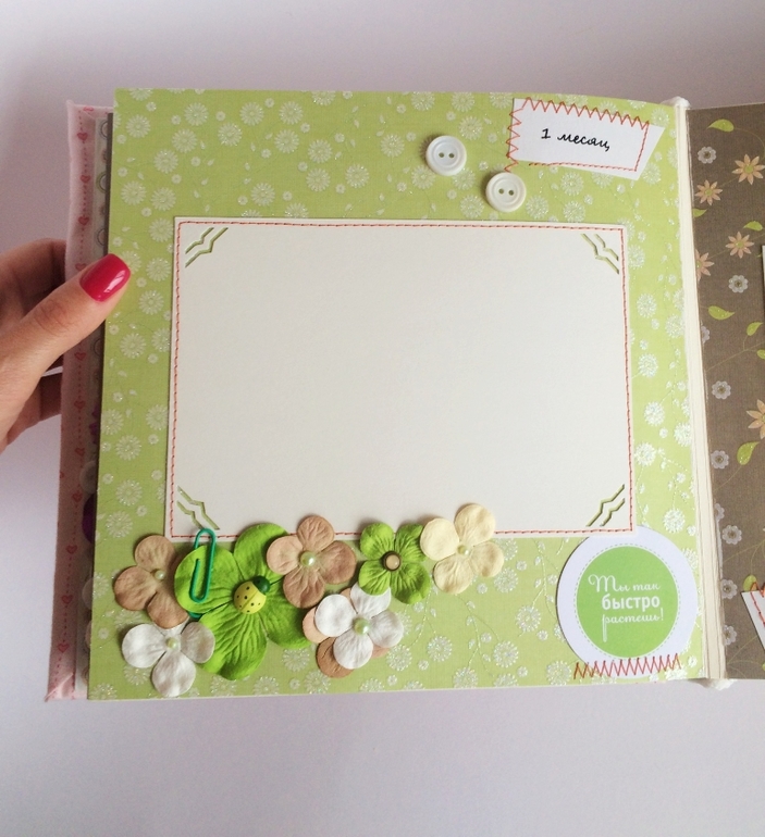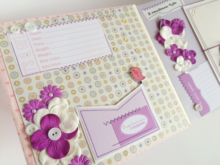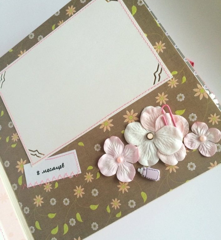 Альбом полностью ручной работы, размер 21*22 см, имеет 10 листов + обложка 2 листа, обложка тканевая и мягкая(синтепон)! Вмешает в себя 28 фотографий, размером 10*15, места для записей, кармашки для узи и тестов! Альбом посвященный Первому Году жизни малышки, по соответствующим тематикам и месяцам! А альбоме использована дизайнерская бумага и картон, цветы, стразы, жемчуг, металлические подвески, глитер и много других самых разнообразных украшений, фигурных вырубок, строчек! Большинство материалов производства США, их я люблю больше!)
