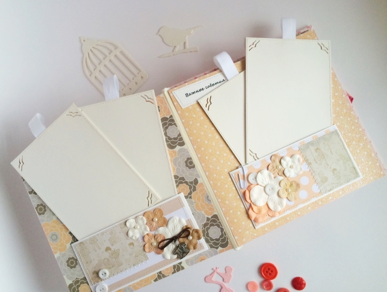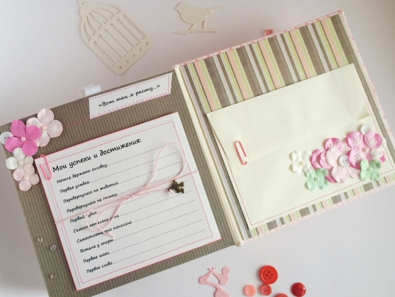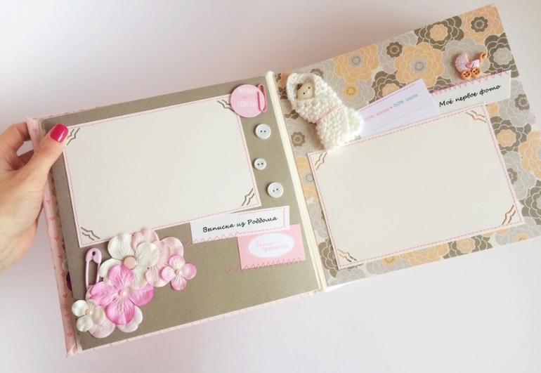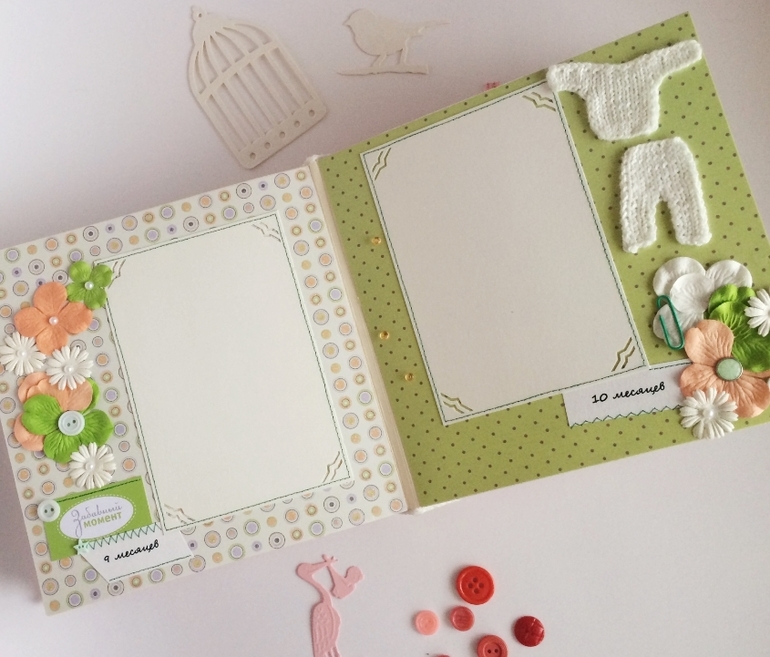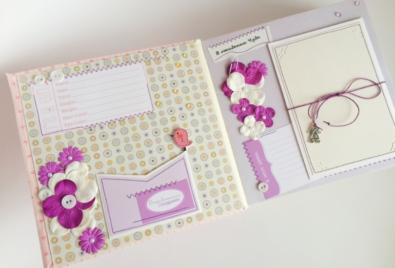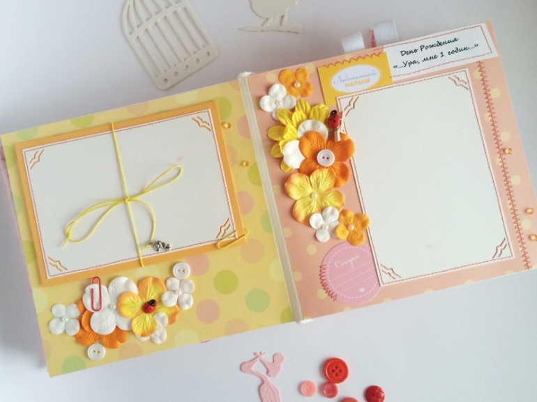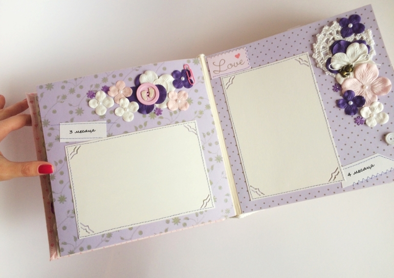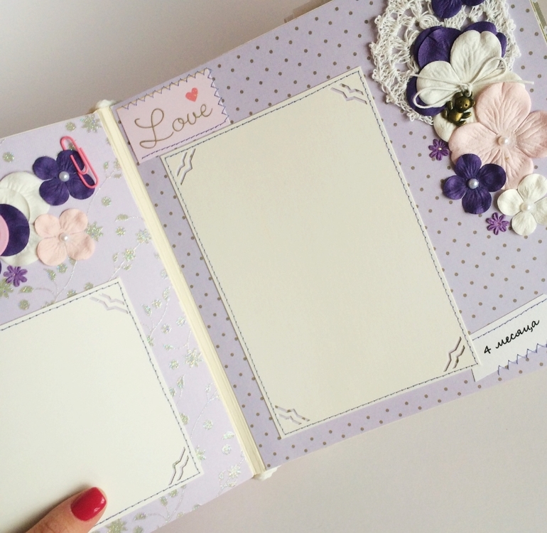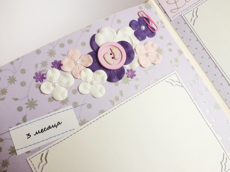 Альбом полностью ручной работы, размер 21*22 см, имеет 10 листов + обложка 2 листа, обложка тканевая и мягкая(синтепон)! Вмешает в себя 28 фотографий, размером 10*15, места для записей, кармашки для узи и тестов! Альбом посвященный Первому Году жизни малышки, по соответствующим тематикам и месяцам! А альбоме использована дизайнерская бумага и картон, цветы, стразы, жемчуг, металлические подвески, глитер и много других самых разнообразных украшений, фигурных вырубок, строчек! Большинство материалов производства США, их я люблю больше!)