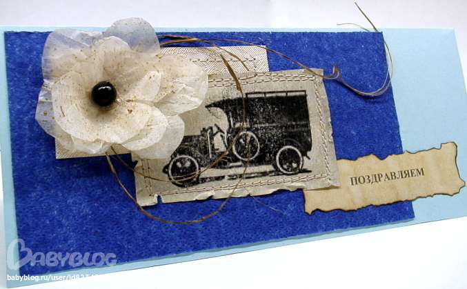 Получилось очень хорошо, хотя визуально кажется что справа голубое пространство к открытки не относится, надо было синюю бумагу сделать шире. А машина и цветок - просто прелесть, очень хорошо получилось.