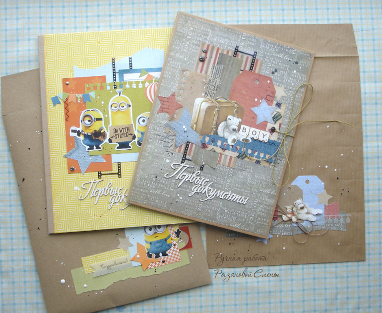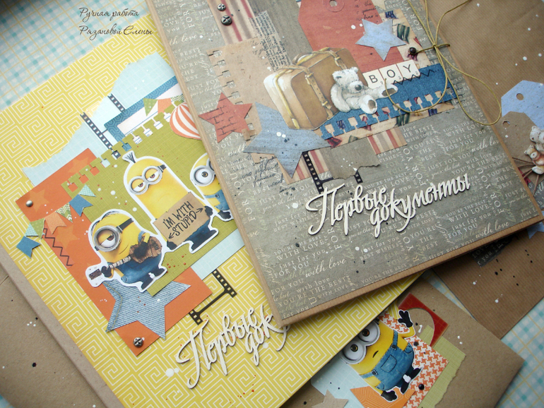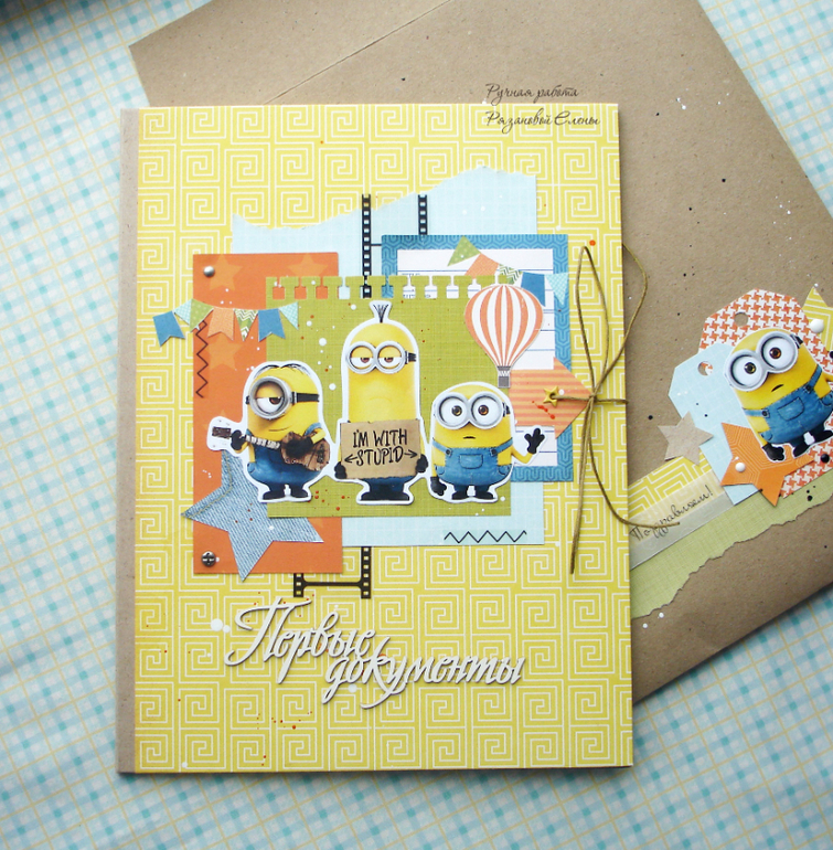 Первая с миньонами для трех детишек сразу!!! Внутри три файла, на одном форзаце кармашек для бумажек, на втором - кармашки для снилсов, закрывается на шнурок. В подарок конверт. Сверху на всех папках прозрачная обложка.
