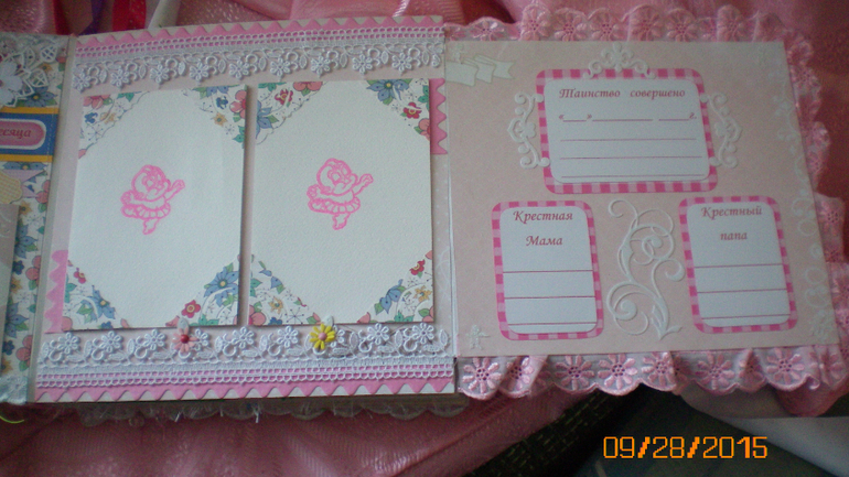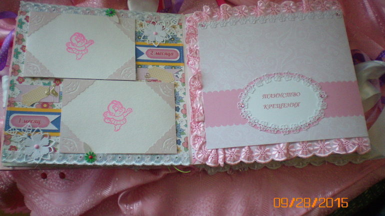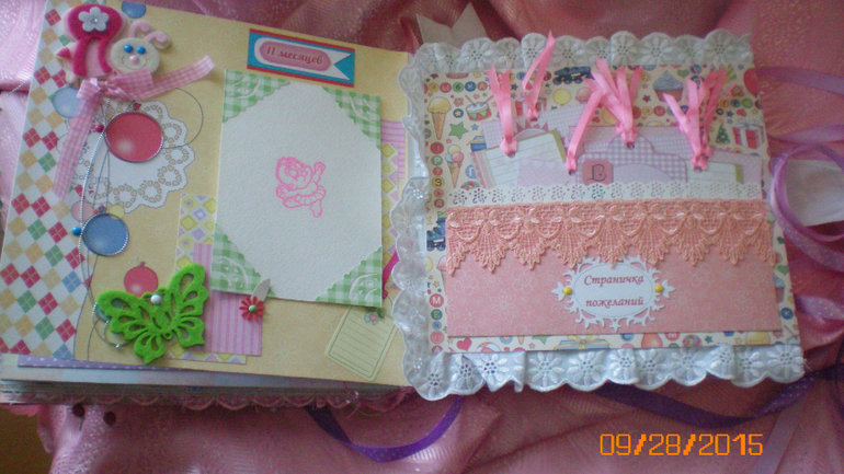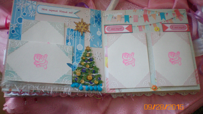 Для первого альбома все очень аккуратно, раскладушек много. От себя хочу добавить, в дальнейшем стараться использовать больше скраповых материалов, натурального кружева и шитья, тогда без лишних блескучих нитей, работа будет выглядеть дороже) А вообще с началом Вас!