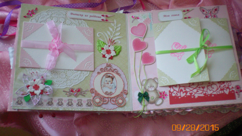 Ольга, посмотрела ваш альбома и вспомнила свой первый. Делала его для дочери - свадебный. Честно сказать, сейчас даже не хочу его смотреть. По тому что опыта набралась, композиции строю по другому, цвета лучше сочетаю, вижу неровности и прочие шероховатости. Недавно спросила у дочери - может переделать? А она "Нет, это же твой первый".