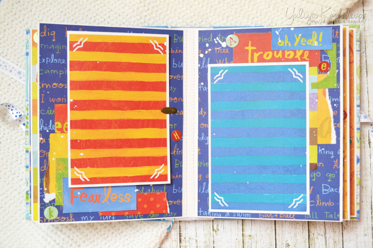 Альбом получился яркий, мальчишечий)) вмещает в себя 32 фото (одно фото вставляется в рамочку на обложке) и имеет 2 конверта для хранения мелочей) Такой вот красивый и простой одновременно… сейчас пробую сделать видео-обзор)))