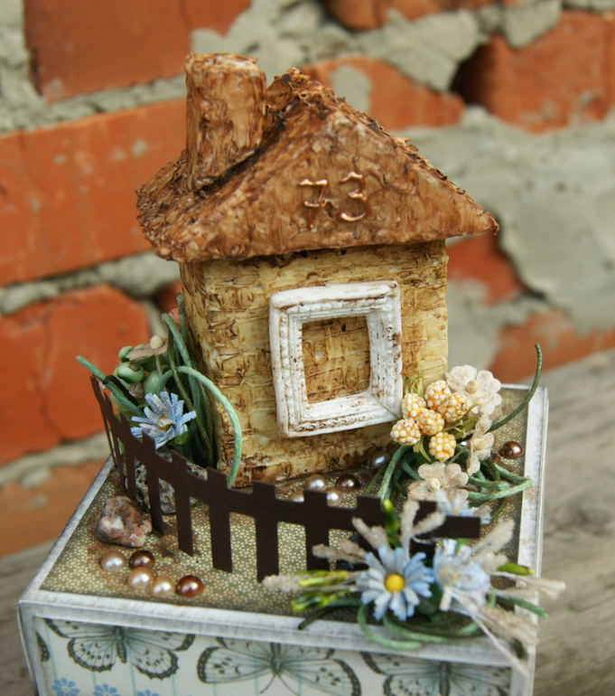 сам домик я вырезала из пенопласта, покрыла текстурной пастой и при помощи кисти и зубочистки сделала имитацию кирпича и черепицы. после высыхания все выкрасила акварельной краской