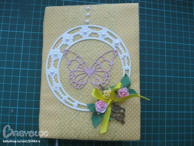 На мой взгляд содержимое блокнота живет отдельно от обложки. Внутри у вас состаренные странички, в пятнышках, этакое ретро. А снаружи новенький такой блокнотик, со свеженькими цветочками. Все по отдельности - очень красиво, но друг с другом оно не сочетается. Нужно или вставить простые чистые листочки или состарить обложку. Кроме того, неплохо было бы обратиться к теории композиции при размещении элементов обложки. Сейчас бабочка и розочки спорят друг сдругом, поэтому ващь не кажется гармоничной и завершенной. В композиции есть главный элемент и второстепенные, а у вас тут 2 главных элемента, поэтому гармонии нет. Можно пользоваться скетчами для открыток при оформлении обложки.