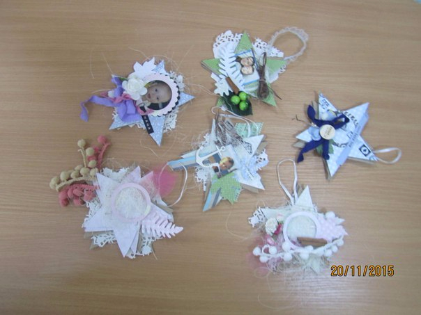 А еще хотела рассказать про мой мастер-класс, но не тот, который анонсировала ( он отложен, увы(), а мастер-класс, который я проводила в детском саду. У воспитателей в программе, по видимому, запланировано проведение какого-нибудь подобного мероприятия для родителей (да, я сама удивилась) и меня припахали. Как вы понимаете, сложно отказать воспитателям своего ребенка, так что я собрала свои манатки нехитрые и вечером пятницы провела такой маленький МК по похожей звездочке ( только с фотографией малыша или с рамочкой для последующего ее заполнения. У нас было 6 участников и среди них один папа оО)