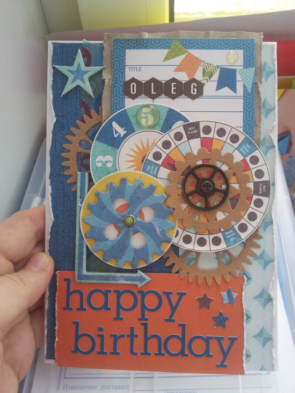 Открытки, приглашения, визиткиПривет, продолжаю осваивать американский стиль, просмотрела курс с Катей Погодиной и решила добавить крафт, слои, детальки. Открытка на ДР мальчику, который любит роботов. Может, стоило бы распечатать картинки с трансформерами, но мы не ищем лёгких путей...Сначала тяжко было мять и рвать, но потом затянуло и еле остановилась:).Шестерёнки даже крутятся, задевая друг друга! Надпись старалась сделать покрупнее и повеселее, остальные варианты терялись рядом с большими кругами. После приступа вдохновения теперь волнуюсь как всё это воспримут родители- помятости и прочее, интересненько...