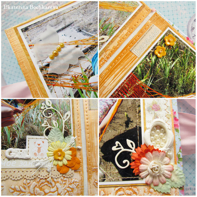 Страницы все выполнены с нуля: картон, грунт, краски, текстурная паста. Пристроила множество обрезок. Еще много с чипа использовала в этом минике. И даже с основой от чипика!:) Сердечко слева - это основа от самого чипика сердца и я, как описывала в , не выбрасываю такие полезные остатки))