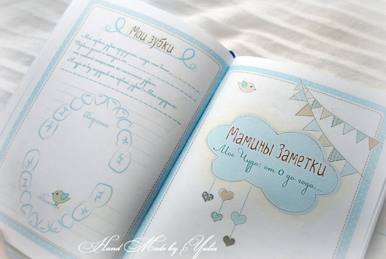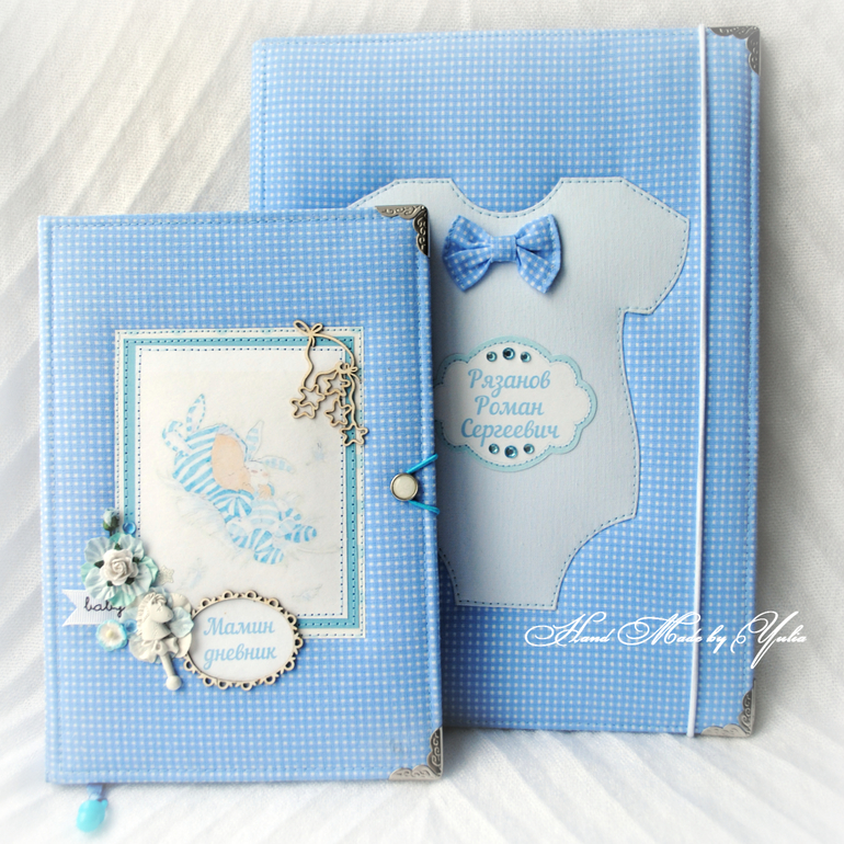 БлокнотыВсем доброго времени суток) редко здесь бываю, постоянно не хватает времени(( и почему в сутках только 24 часа?Хочу показать вам нежненький наборчик для мальчика. Это папка для документов и мамин дневничок. В папку поместиться свидетельство о рождении, полис,снилс и сертификат о прививках. А в дневничок можно записывать все о первом годе жизни малыша, график роста и веса, о том как резались зубки. Есть странички для отпечатков ручки и ножки. Так же на каждый месяц предусмотрено по две странички. В середине есть плотный разделитель, на нем мама малыша может сделать мини фотоколлаж с первого дня рождения мальчика и украсить его высечками из набора) А еще на первом форзаце есть конвертик для бирочки из роддома)