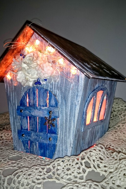 Домик-фонарик. Пока стоит без гирлянды,не могу найти маленький размер на батарейках,чтобы с розеткой не возиться.