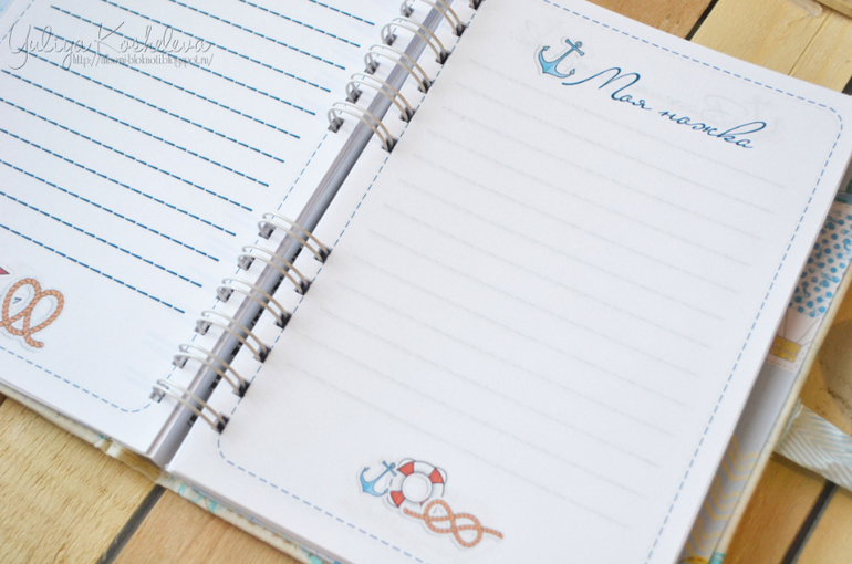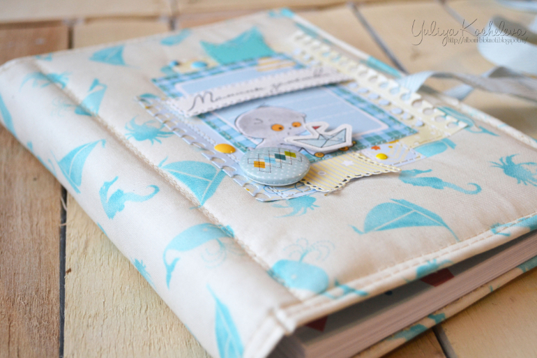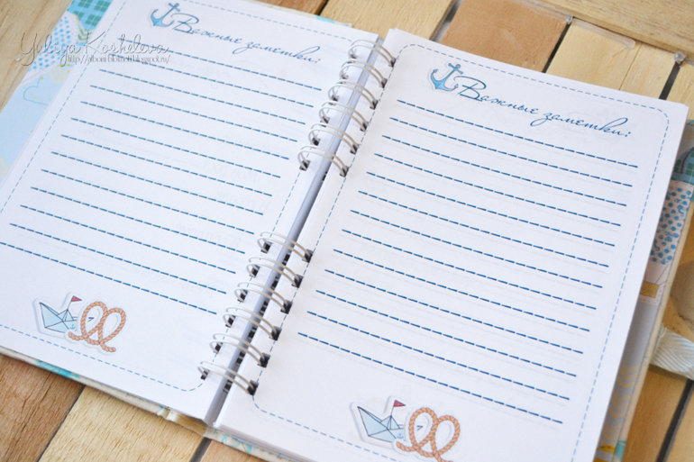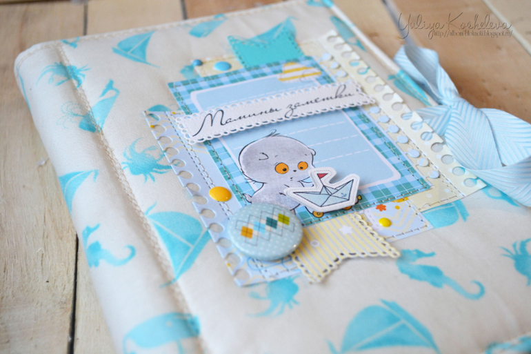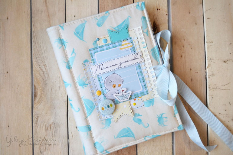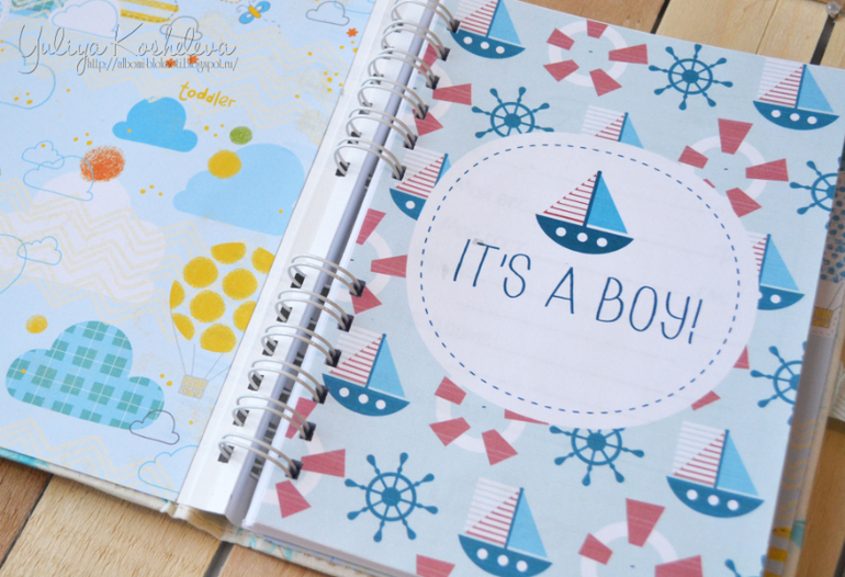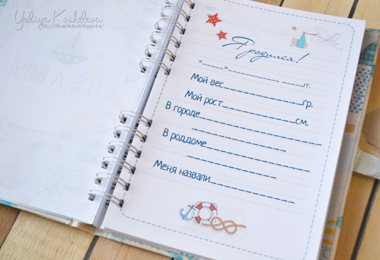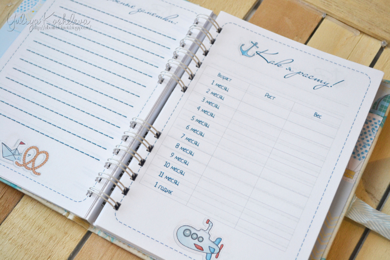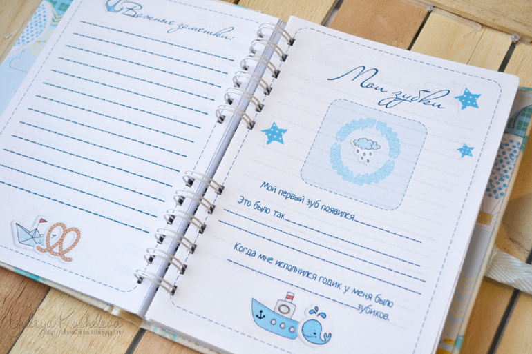 Он мой первый, пока пробуюсь)) Блокнотик в морском стиле, форматом А5, в мягкой тканевой обложке, 70 страниц в авторском дизайне, на которых вы запишите как развивается ваш мальчик в первый год жизни!!! Странички я тоже делала сама...пробую пока их на вкус и верстку))Поэтому если кому нужно по душу страничек пишите отдам по символической цене))