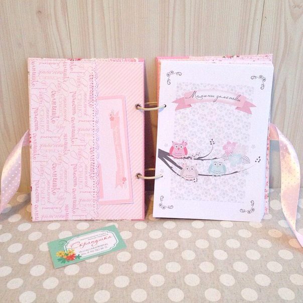 БлокнотыИ еще мамины блокнотики, только уже со страничками коллекции "Совушки" .Мягкая хлопковая обложка, кружево придают им неповторимую нежность, крепление на кольцах позволяет в последствии добавлять еще листы и переставлять их в нужном порядке. Содержит декорированные разделители на каждый месяц для фото и тематические странички: привет это я, обо мне, мамочки и папочка, здравствуй дом, мое имя, мои шаги, зубки и первые слова, развитие по месяцам 1-12, моя ручки и ножка, мамины заметки+ линовка. Выполнены на заказ.