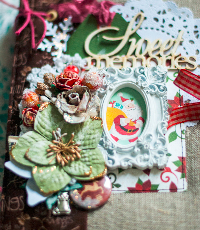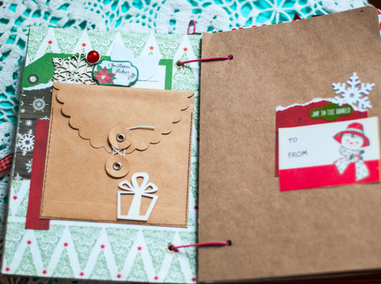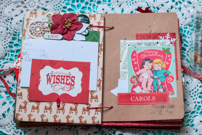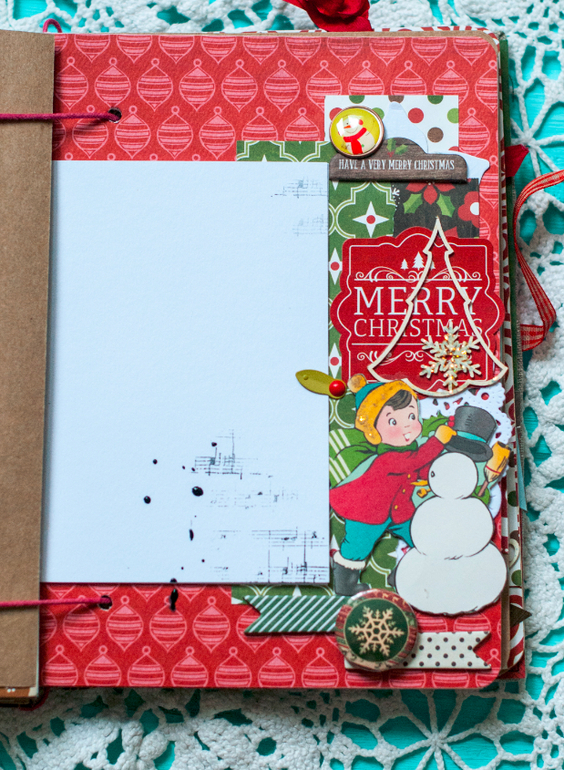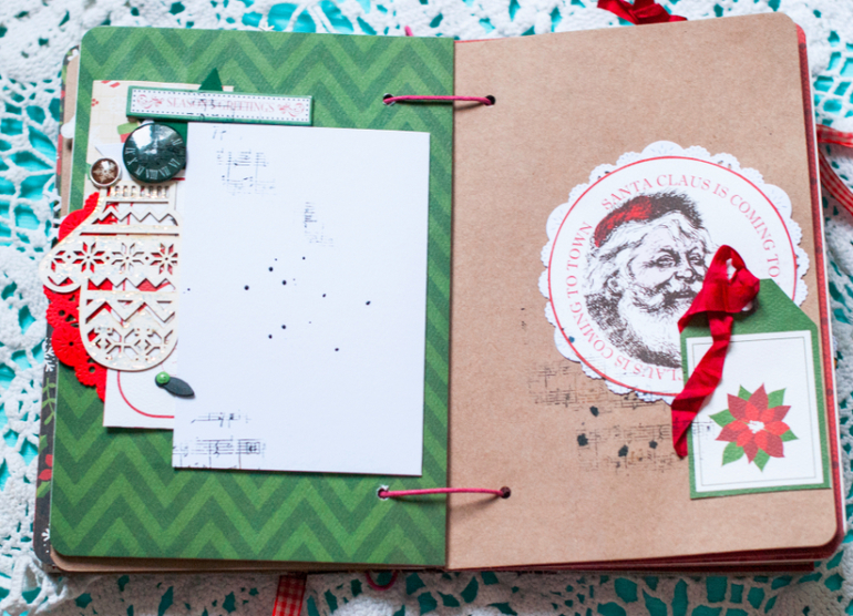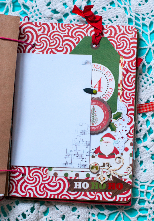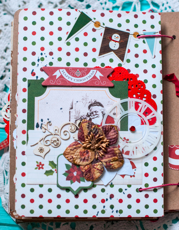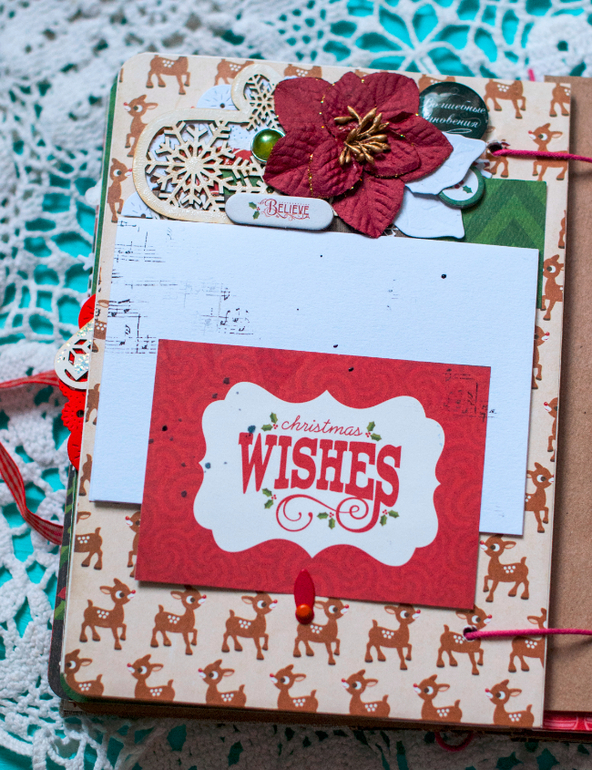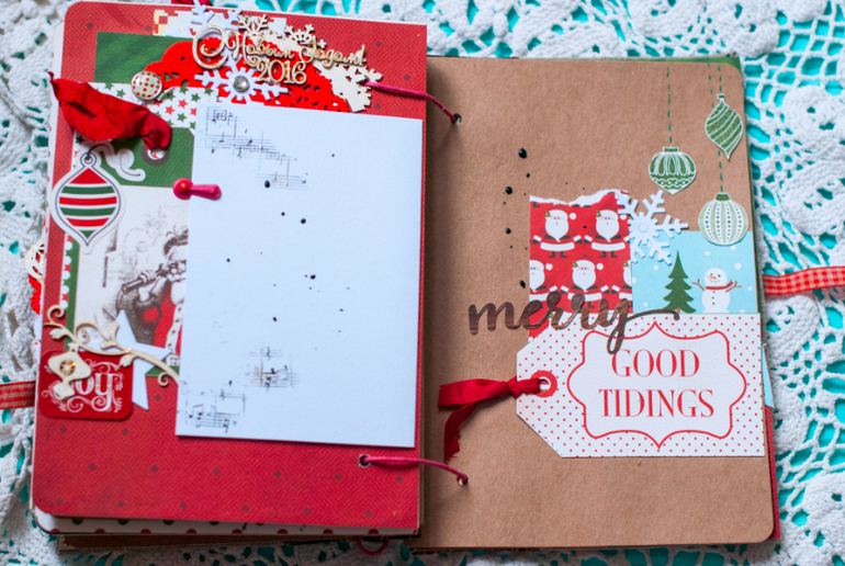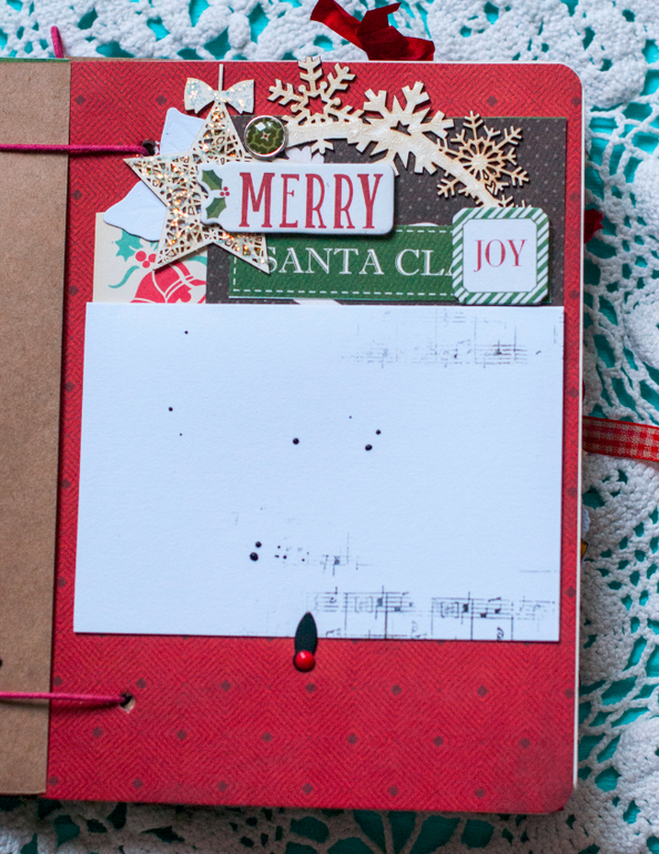 В целом и общем альбомчик получился очень похожим на мой. В нем 5 листов с местами для фото и записей, между ними проложены листы плотного крафта
