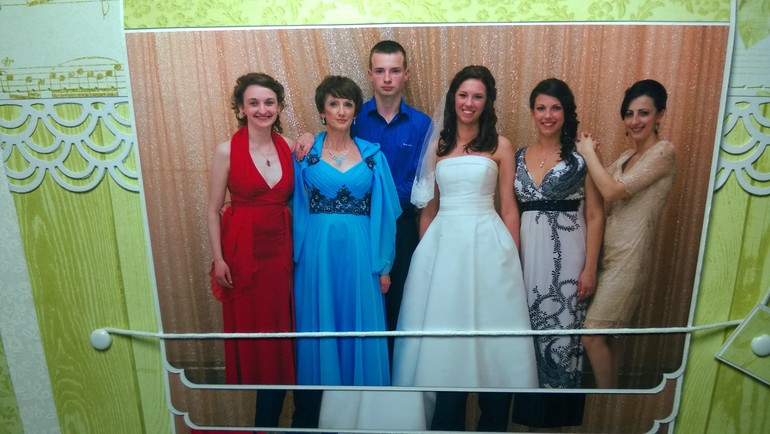 Я в бежевом платье (и самая старшая), невеста - следом за мной, потом сестра Женя (считает себя самой красивой) в бело-сером платье, потом Даша в красном платье (считает себя самой умной), ну последний пятый ребенок и единственный брать - Тима. И самое главное - наша мама красавица!