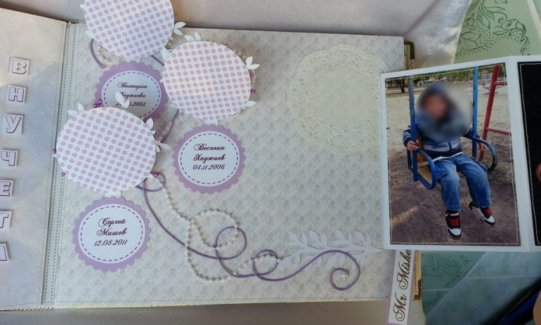 На другой странице - Мой красавчик - 5 фото и под букетиками данные про внуков и фото круглые, здесь еще не приклеянны.