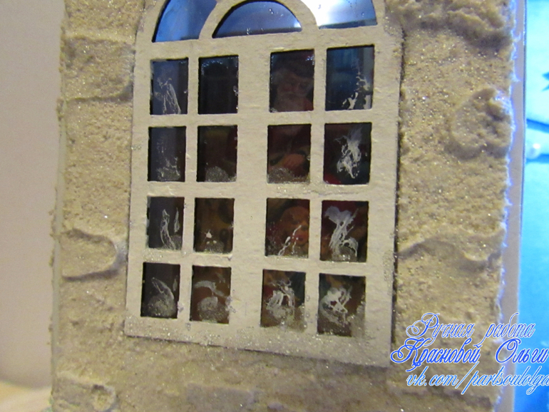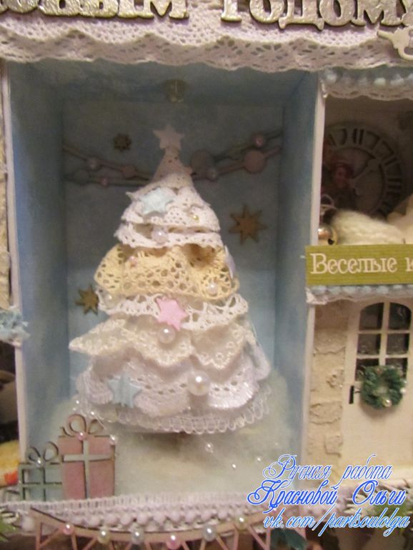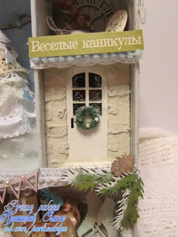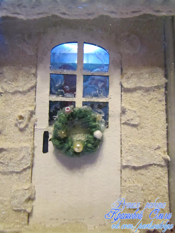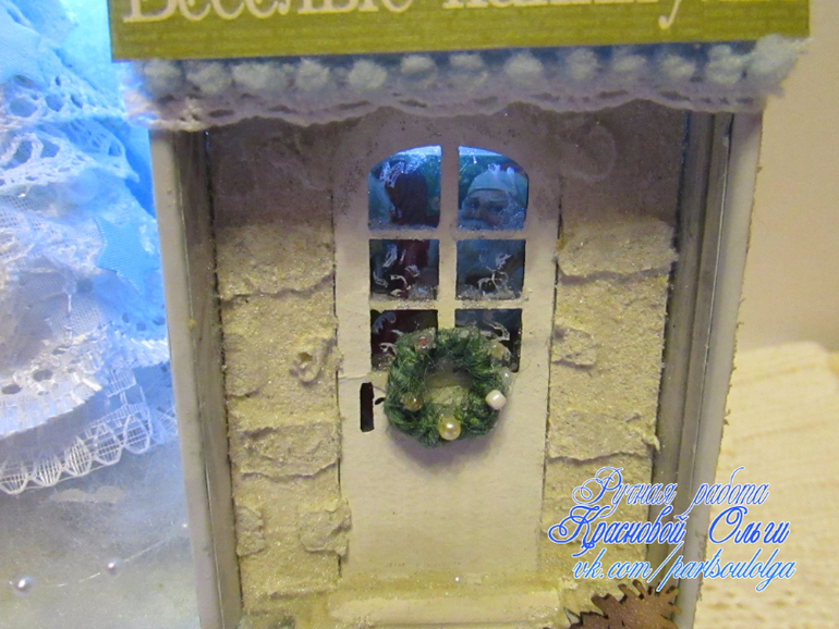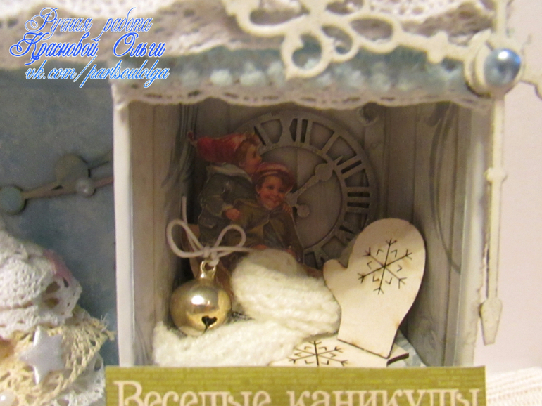 Если посмотреть чуть выше, можно увидеть сцены еще интереснее. Тут и дверь с новогодним венком, видите, в окошке двери Дед Мороз уже готовит елку к празднику? А в окне выше? Праздник уже во всю. Но это будет позже, а пока посмотрите в верхний правый угол. Часы. Настоящие винтажные стрелки часов. Дети на санках веселятся на улице, варежки, вязаный шарф, бубенцы. У них еще есть время, пока не пробила полночь! Как раз топится камин. Нежная белоснежная елочка уже украшена. А в полночь начнется праздник, с семьей, с любимцами, со всеми-всеми!